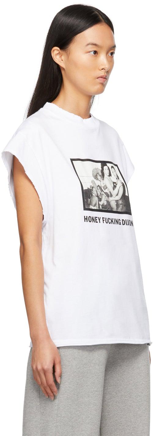 Short sleeve cotton jersey T-shirt in white. Distressing throughout. Rib knit crewneck collar. Logo and graphic printed in tones of black, off-white, and grey at front. Rolled raw edge at hem. Supplier color: White print 100% cotton. Brand: Honey Fucking Dijon