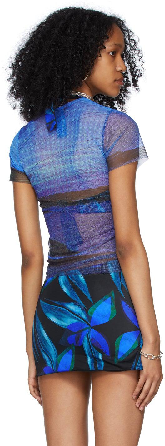 Short sleeve semi-sheer stretch mesh T-shirt in blue featuring multicolor graphic pattern. Crewneck collar. Raw edge at cuffs and hem. Supplier color: Blue landscape 80% polyester, 20% elastane. Brand: Louisa Ballou