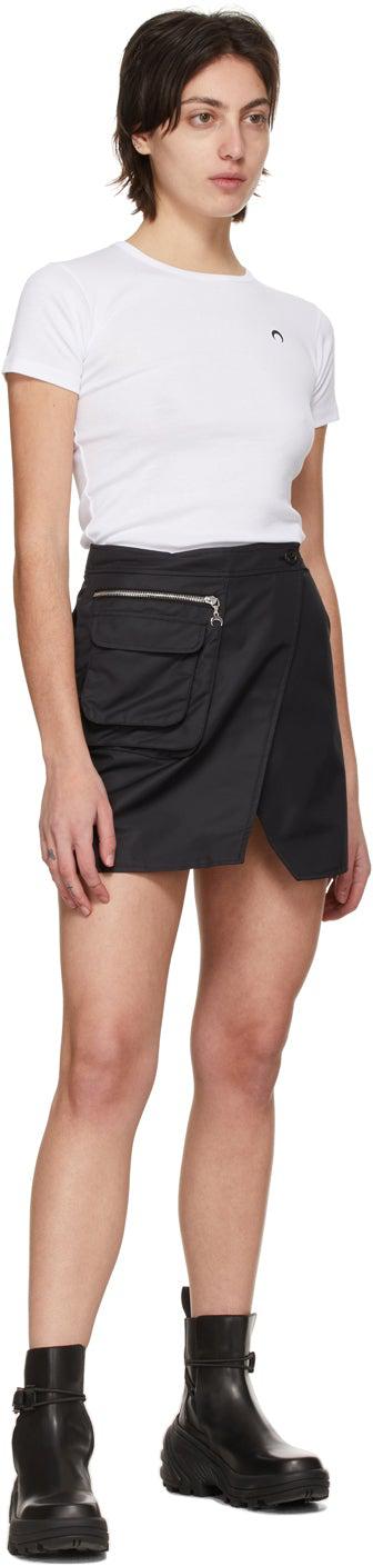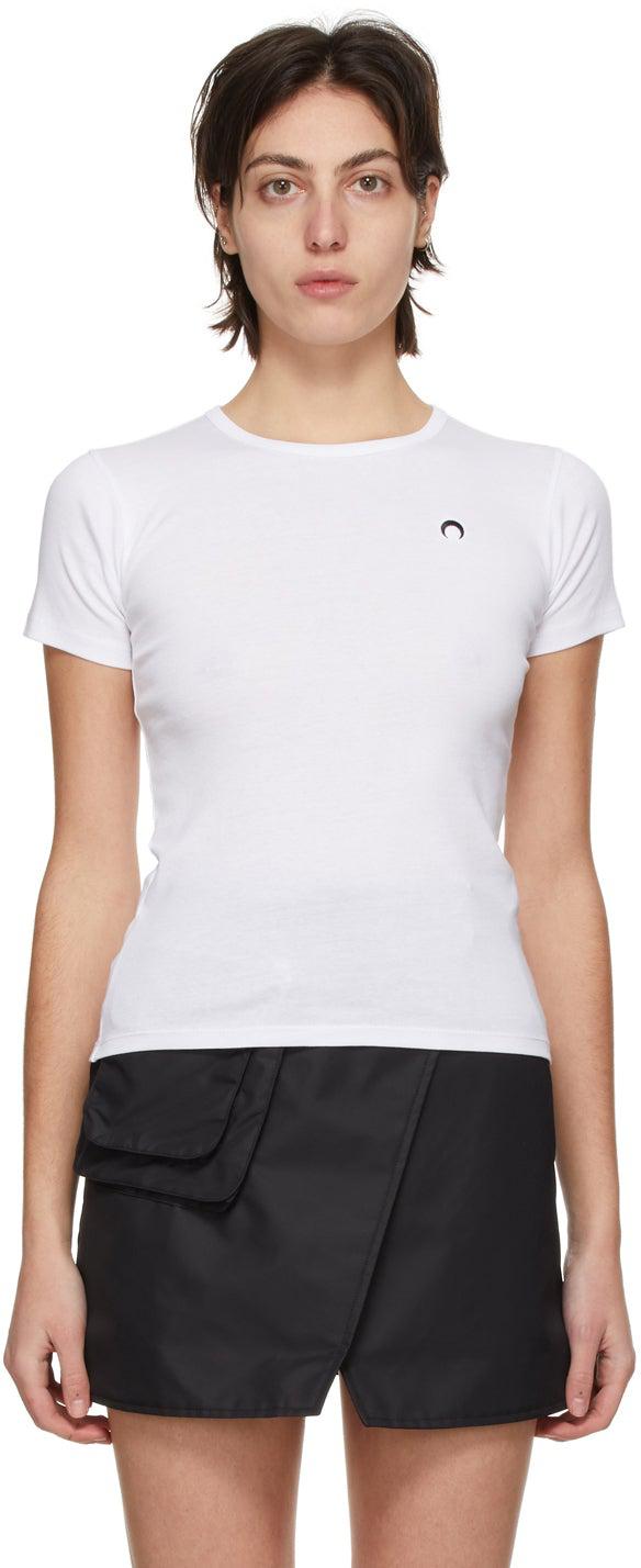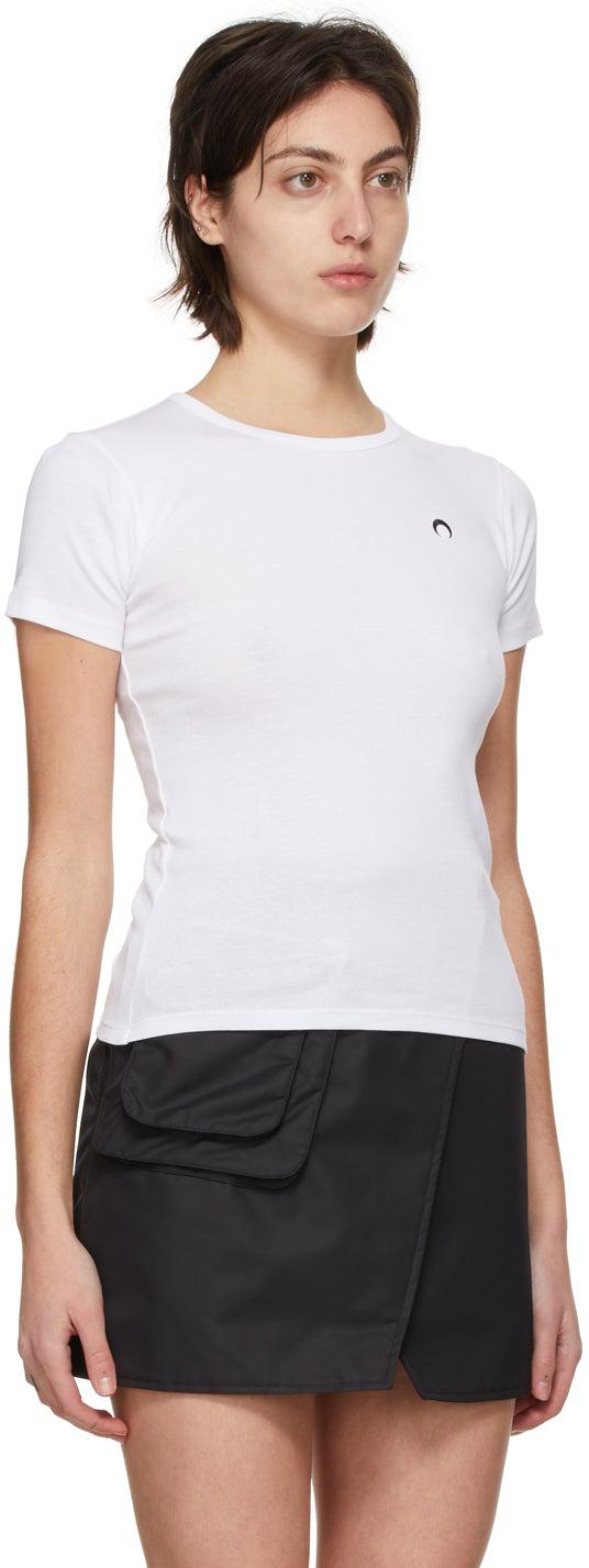 Short sleeve cotton jersey T-shirt in white. Rib knit crewneck collar. Logo embroidered in black at chest. Supplier color: White/Black 100% organic cotton. Brand: Marine Serre