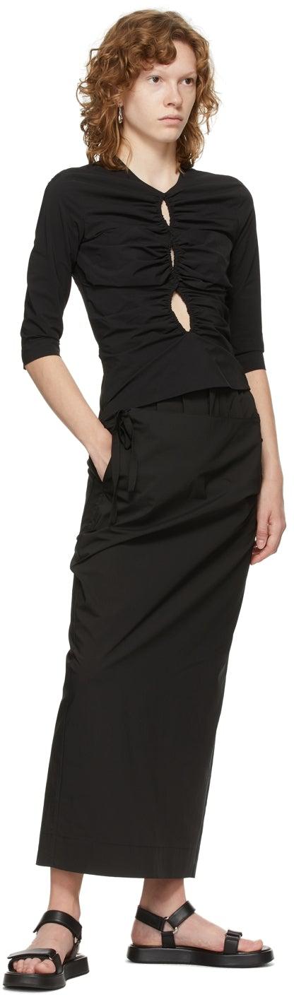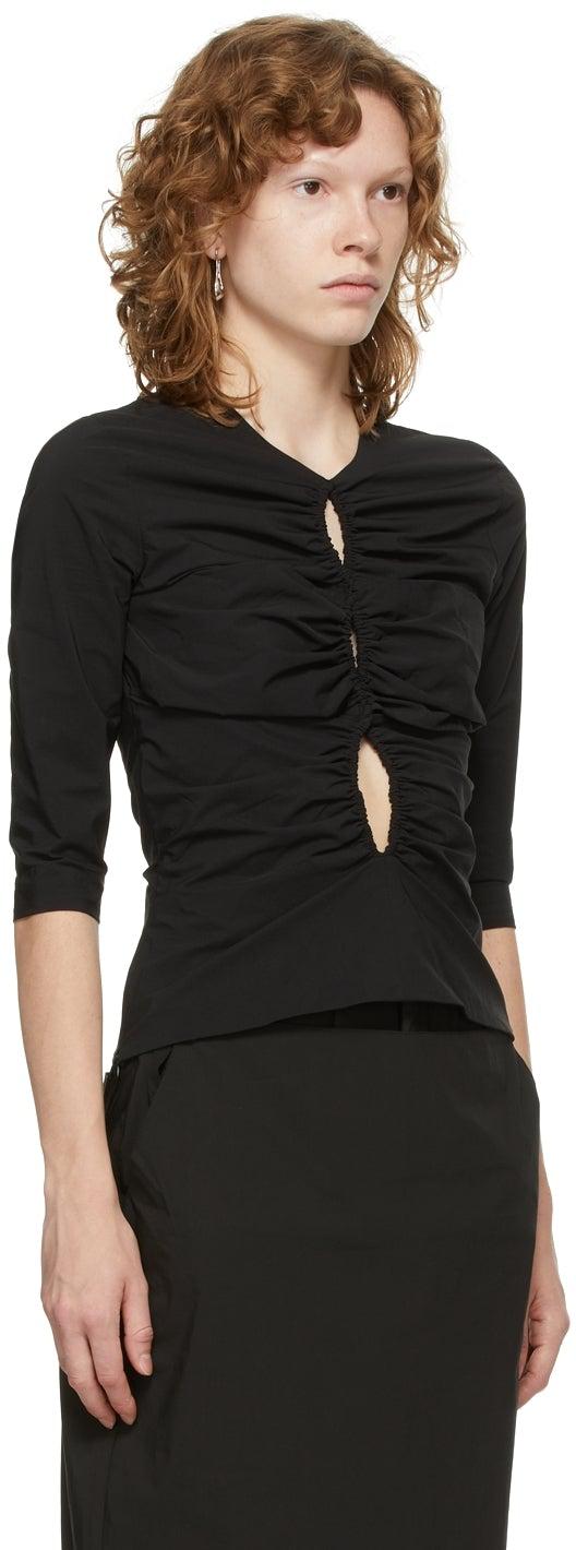 Three-quarter sleeve stretch cotton-blend poplin T-shirt in black. Crewneck collar. Cut-outs and ruching at front. Concealed zip closure at side. Ruching at sleeves. Cut-out with button fastening at back. Supplier color: Black 66% polyamide, 26% cotton, 8% elastane. Brand: Markoo