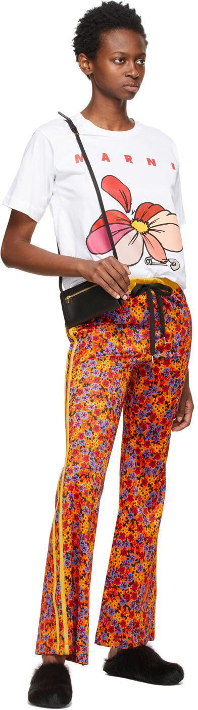 Short sleeve cotton jersey T-shirt in white. Rib knit crewneck collar. Logo printed in red at chest. Graphic printed in multicolor at front. Supplier color: White 100% cotton. Brand: Marni