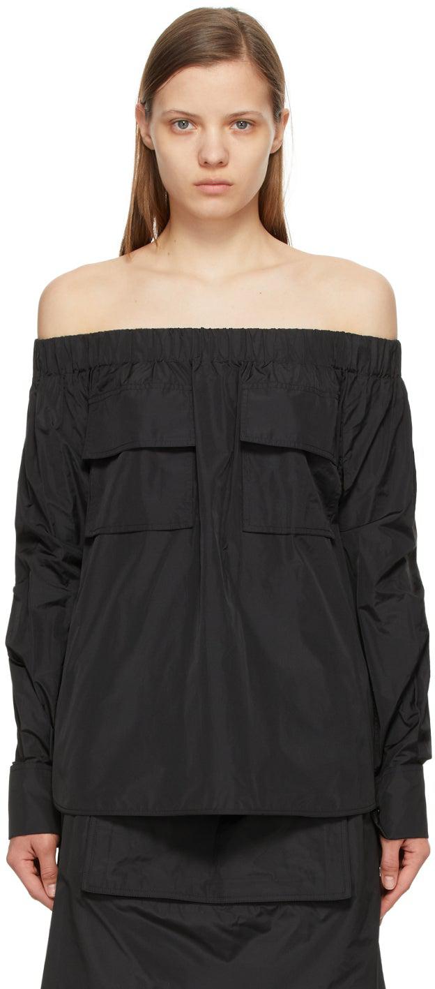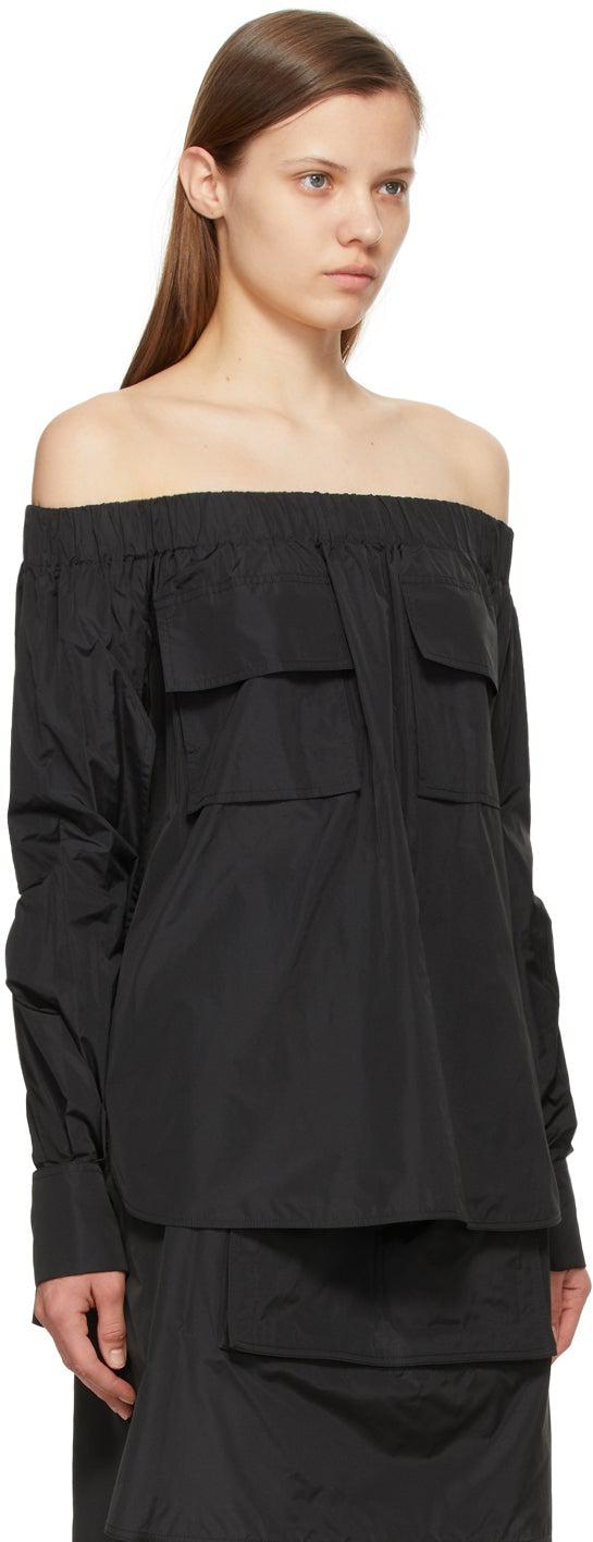 Long sleeve silk-blend taffeta shirt in black. Elasticized off-the-shoulder collar. Flap pockets at chest. Cutout at sleeves. Two-button French cuffs. Shirttail hem. Tonal hardware. Supplier color: Black 71% polyester, 29% silk. Brand: Max Mara