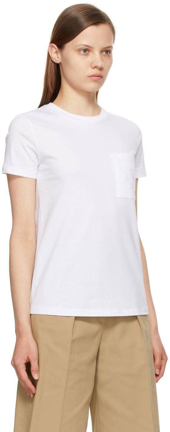 Short sleeve cotton jersey T-shirt in white. Rib knit crewneck collar. Patch pocket featuring tonal embroidered logo at chest. Supplier color: Antique white 100% cotton. Brand: Max Mara