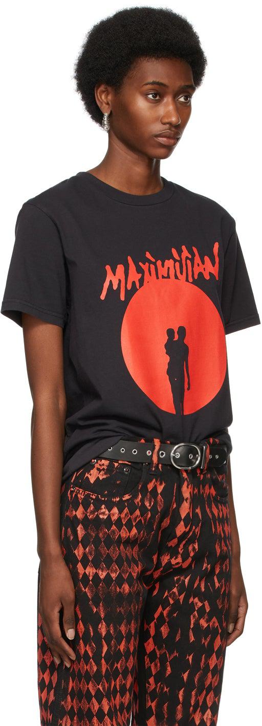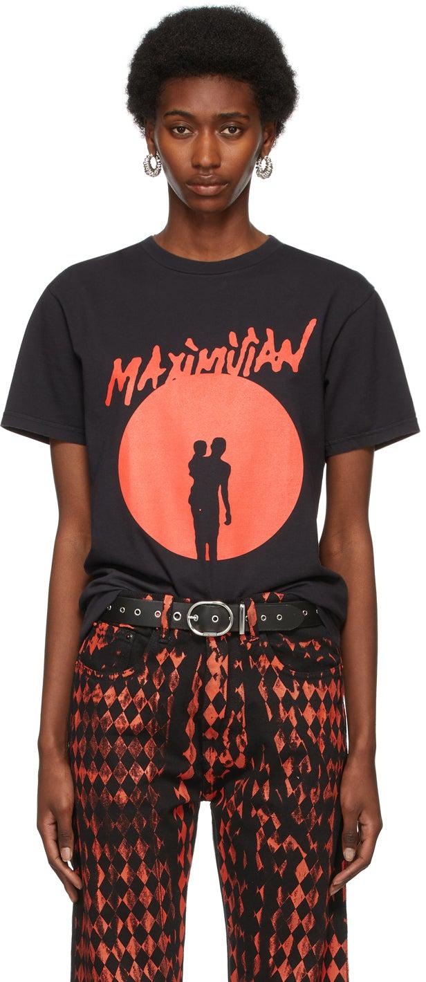 Short sleeve cotton jersey T-shirt in black. Rib knit crewneck collar. Logo graphic printed in red at front. Supplier color: Black 100% cotton. Brand: Maximilian