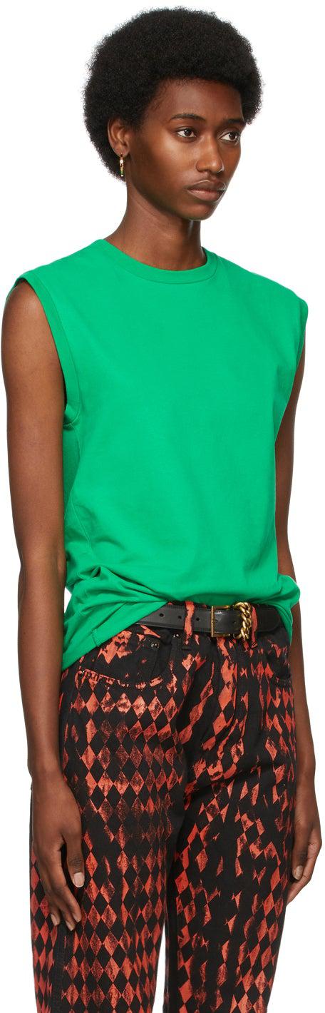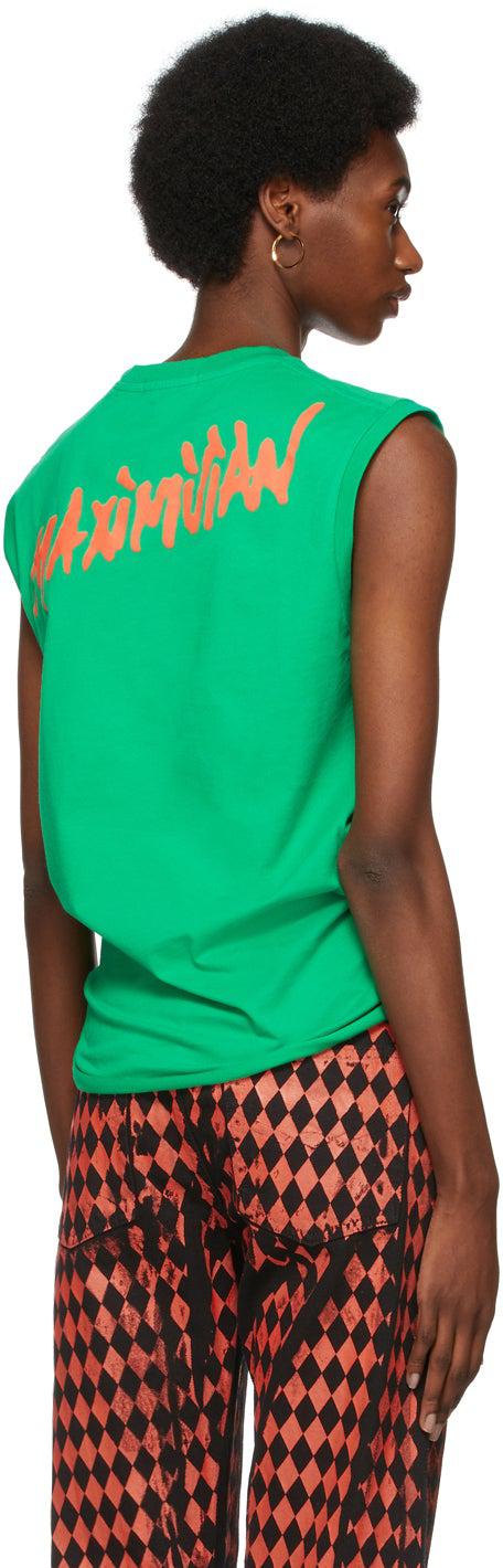Sleeveless cotton jersey T-shirt in green. Rib knit crewneck collar and armscyes. Unfinished edge at hem. Logo printed in red at back. Supplier color: Green 100% cotton. Brand: Maximilian