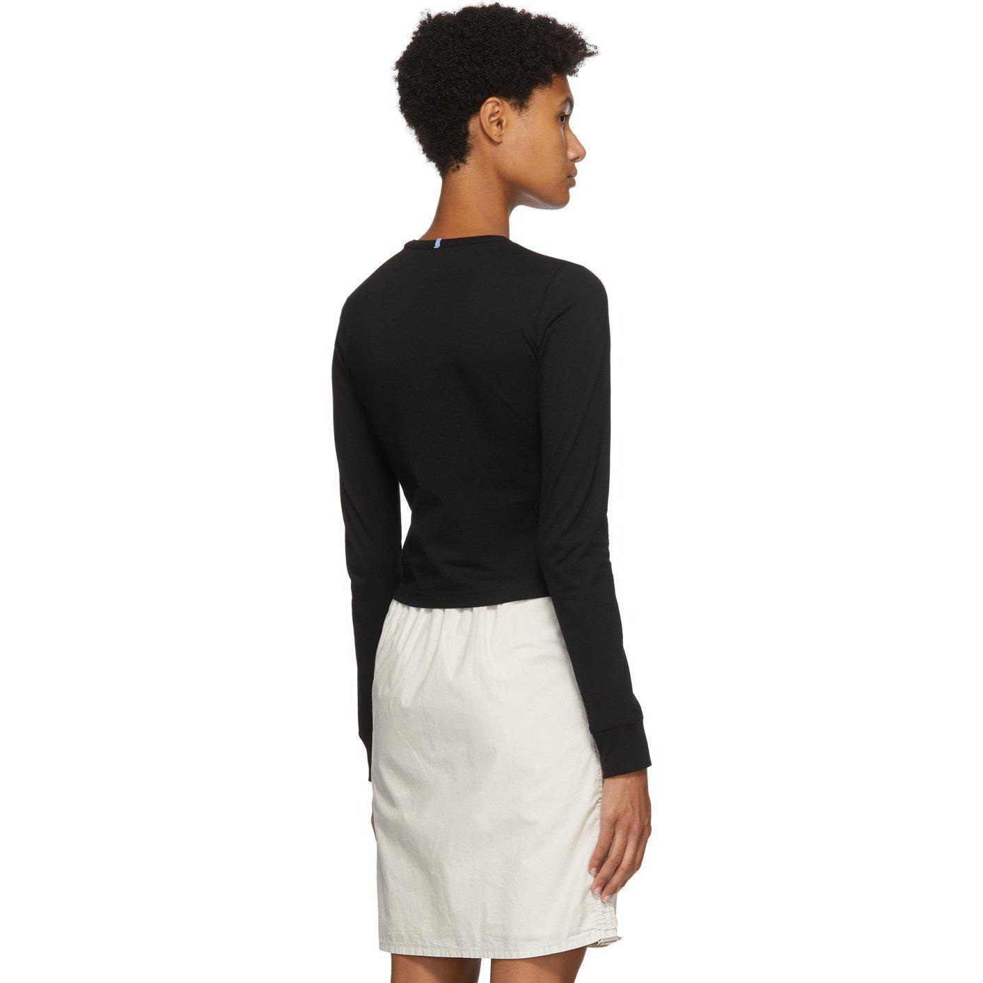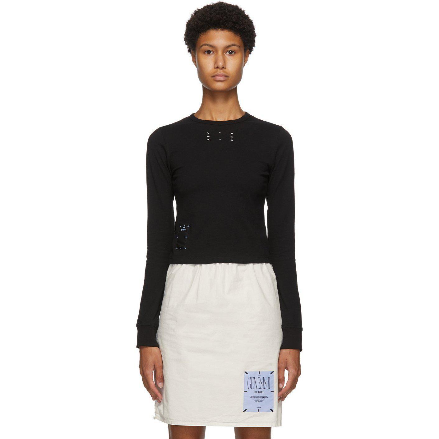Long sleeve cotton jersey T-shirt in black. Rib knit crewneck collar and cuffs. Graphic bonded in white at chest. Tonal textile logo patch at hem. Textile flag in blue at back collar. Part of the Genesis II collection. Supplier color: Darkest black Body: 100% cotton. Trim: 100% polyester. Brand: MCQ