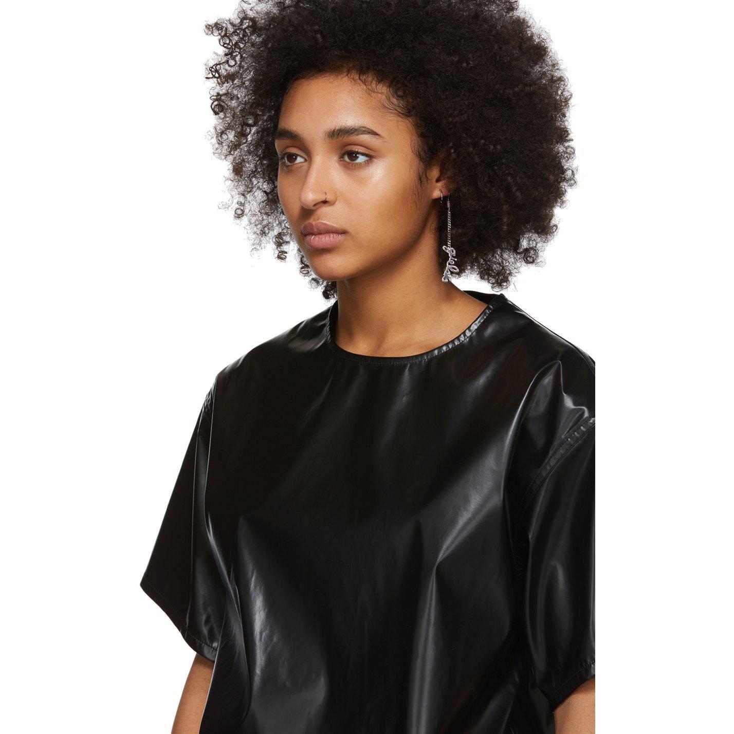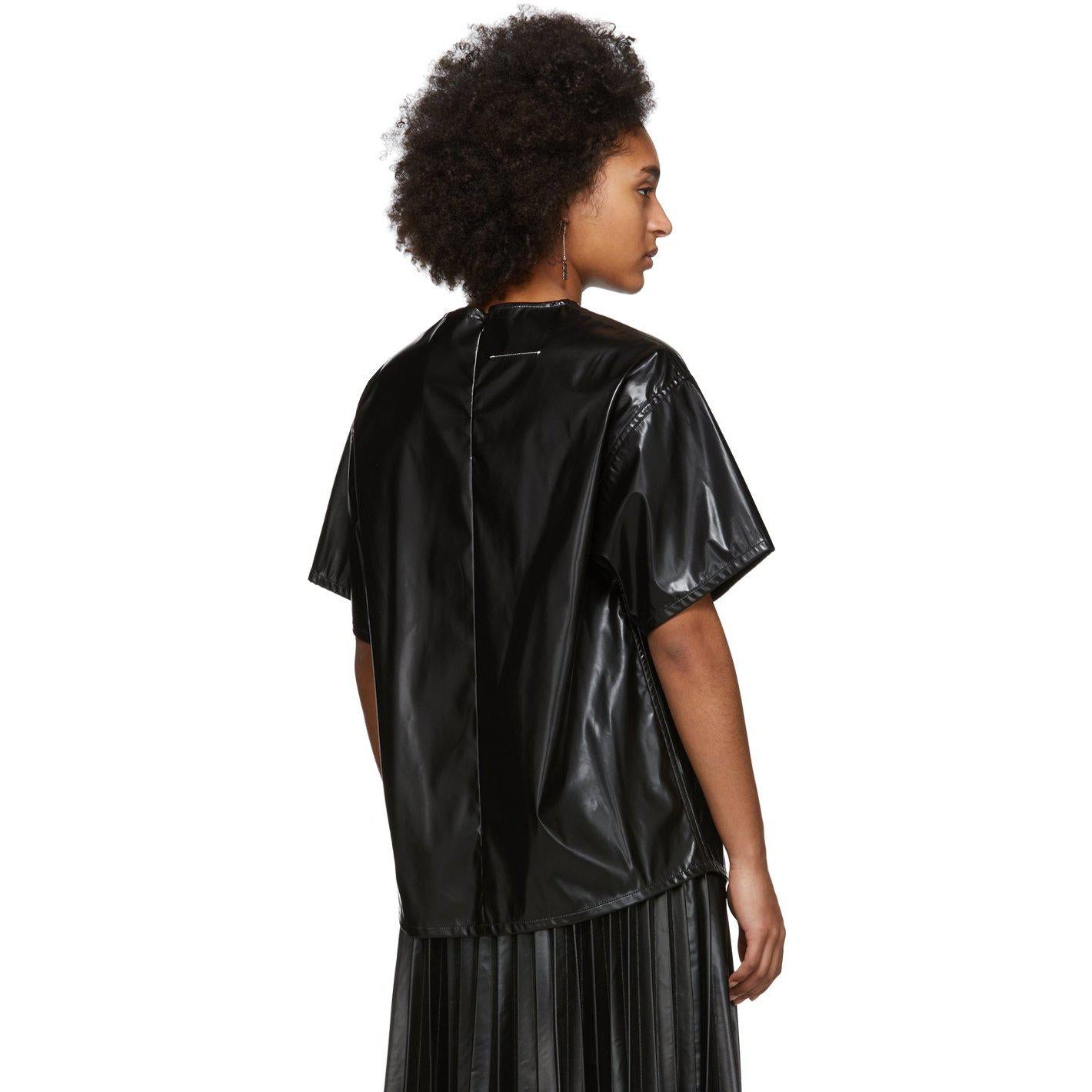 Short sleeve polyurethane-coated blouse in black. Crewneck collar. Signature stitching in white and zip closure at back. Supplier color: Black Body: 100% polyester. Coating: 100% polyurethane. Brand: MM6 Maison Margiela