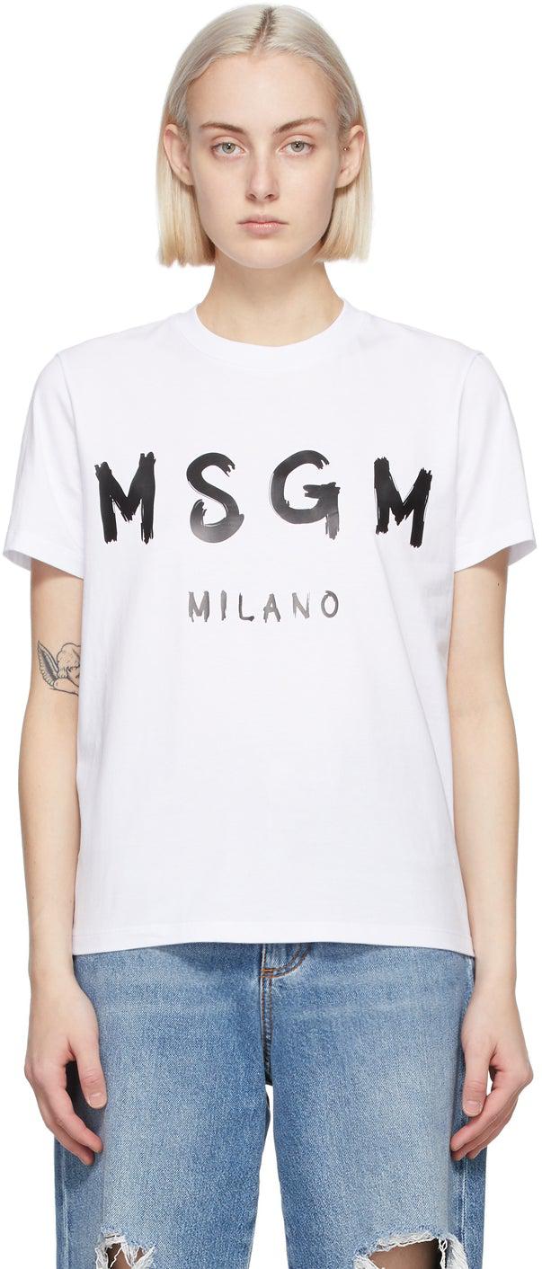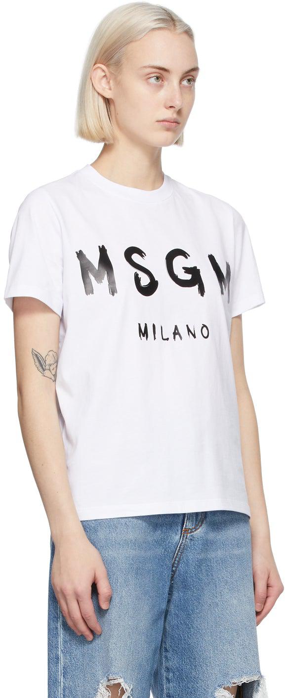 Short sleeve cotton jersey T-shirt in white. Rib knit crewneck collar. Bonded logo in black at chest. Supplier color: White 100% cotton. Brand: MSGM