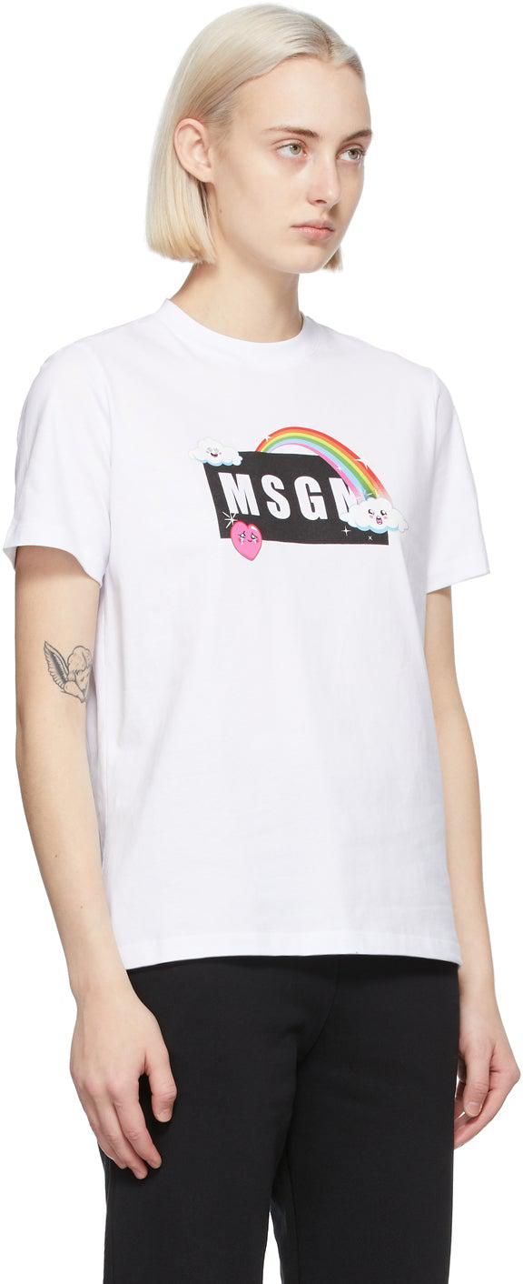 Short sleeve cotton jersey T-shirt in white. Rib knit crewneck collar. Multicolor logo graphic printed at chest. Supplier color: White 100% cotton. Brand: MSGM
