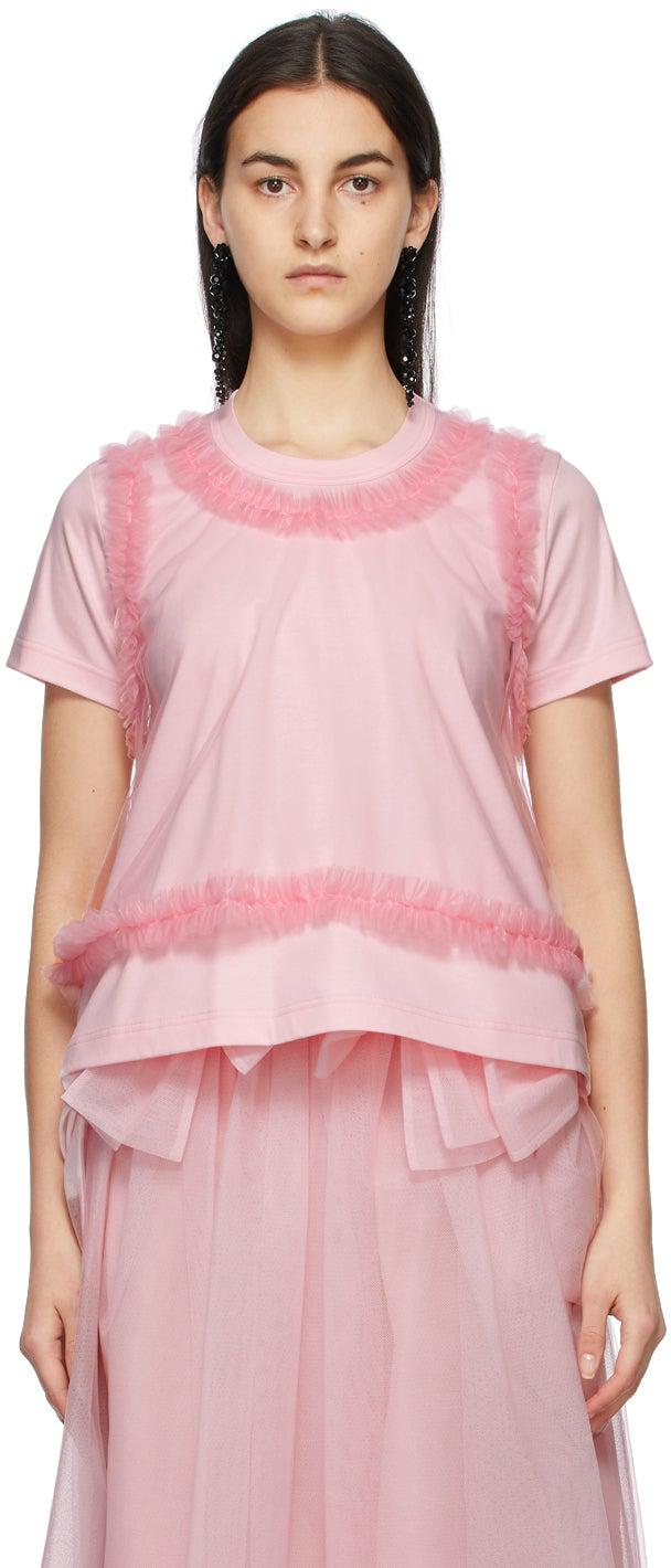 Short sleeve cotton jersey T-shirt in pink. Tonal tulle overlay featuring ruffled detailing throughout. Crewneck collar. Supplier color: Pink Body: 100% cotton. Trim 1: 100% nylon. Trim 2: 100% polyester. Brand: Noir Kei Ninomiya