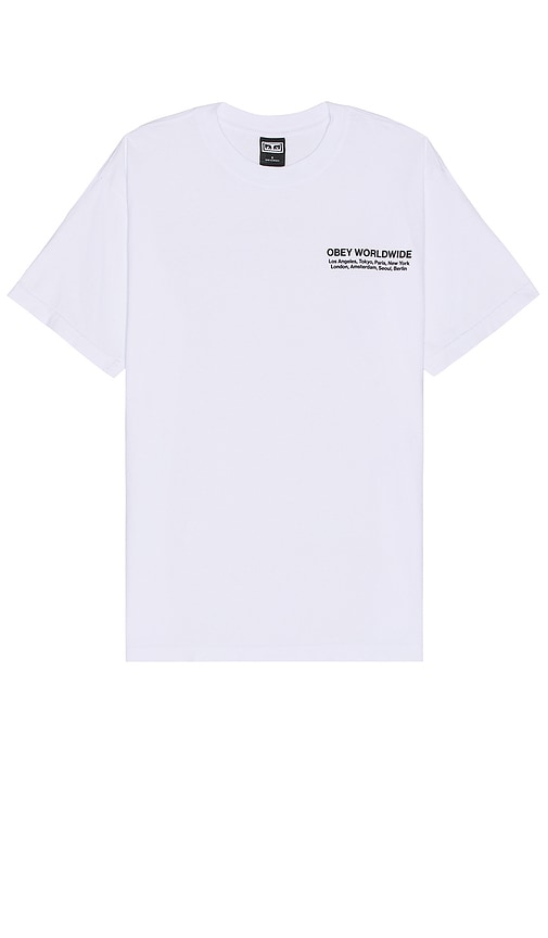 Obey Worldwide Cities Tee in White. - size L (also in M, S) Obey Worldwide Cities Tee in White. - size L (also in M, S) 100% cotton. Made in Mexico. Machine wash. Front and back Obey logo detail. Thick jersey fabric. OBEY-MS328. 166913572. OBEY Clothing was launched based on artist Shepard Fairey the look is a mix of progressive design, classic street wear, and apparel basics. Fairey gets his inspiration from the art scene of underground skateboarding, the rock, punk, and hip hop movements from the music scene, and more recently from the reflection of world leaders and the political realm. Shop the latest in fashion from Obey