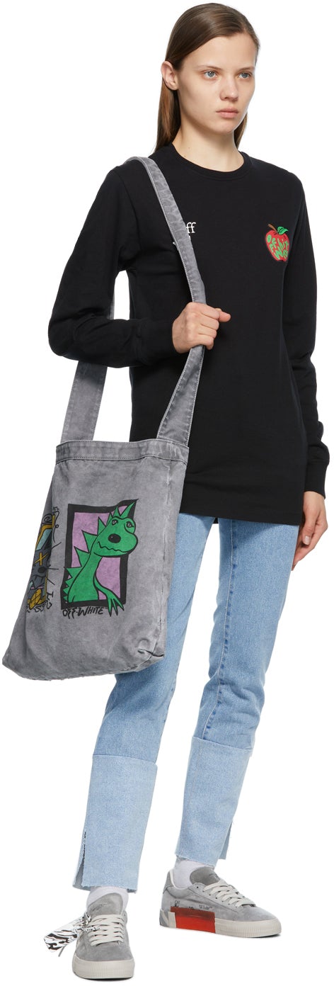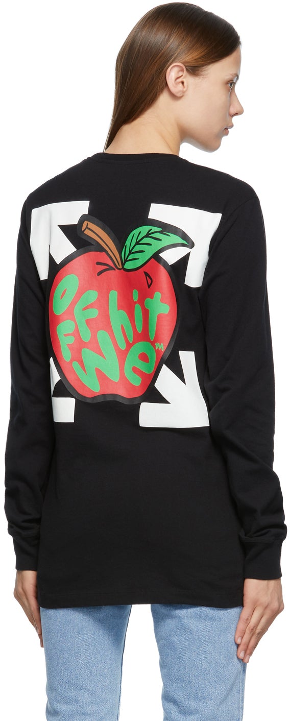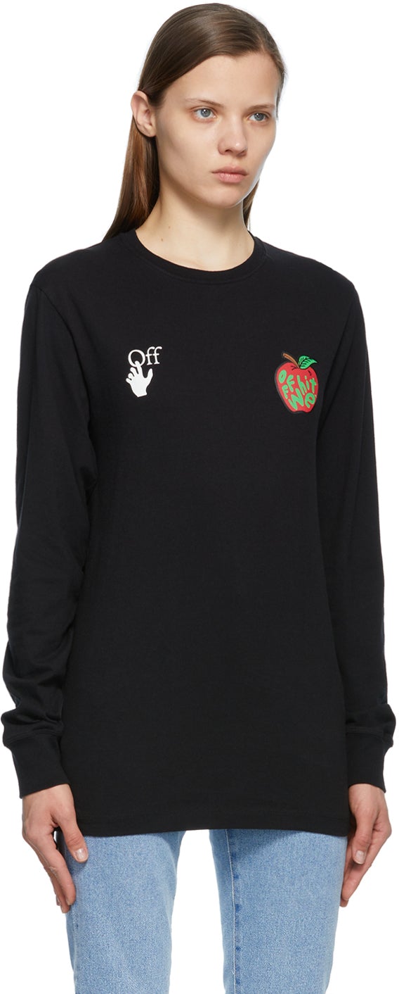 Long sleeve cotton jersey T-shirt in black. Rib knit crewneck collar and cuffs. Logo graphic printed in white, red, and green at chest and back. Supplier color: Black/Red 100% cotton. Brand: Off-White