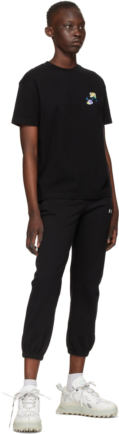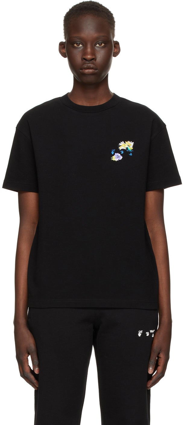 Short sleeve cotton jersey T-shirt in black. Rib knit crewneck collar. Logo printed in blue at chest. Graphic embroidered and printed in multicolor at chest and back. Supplier color: Black 100% cotton. Brand: Off-White