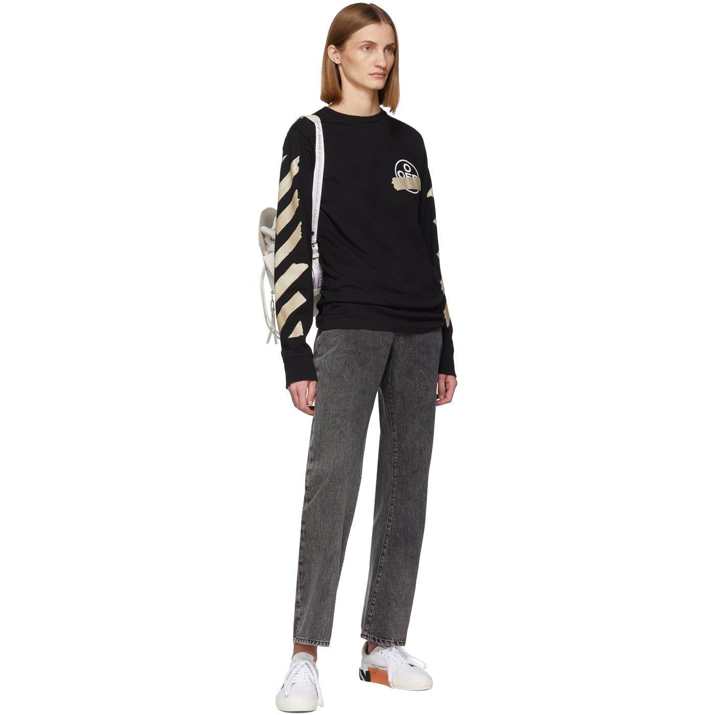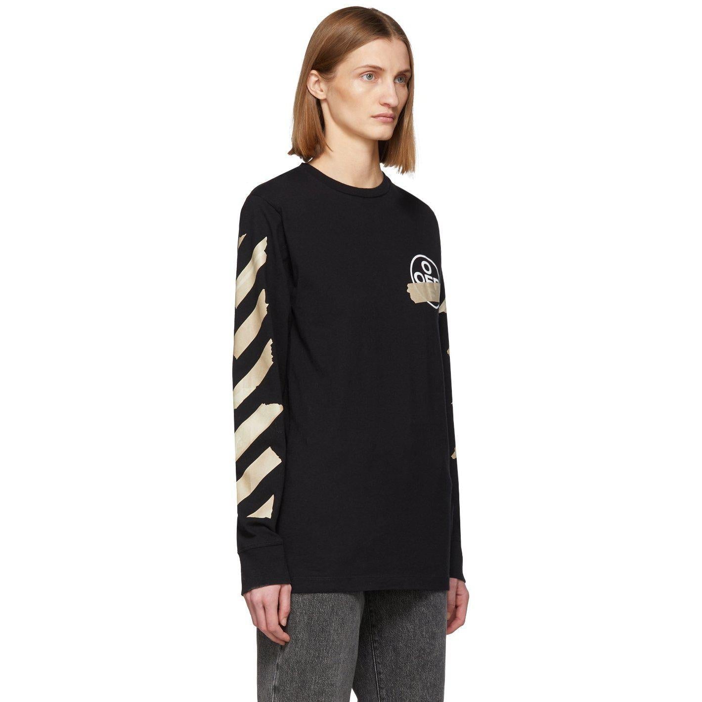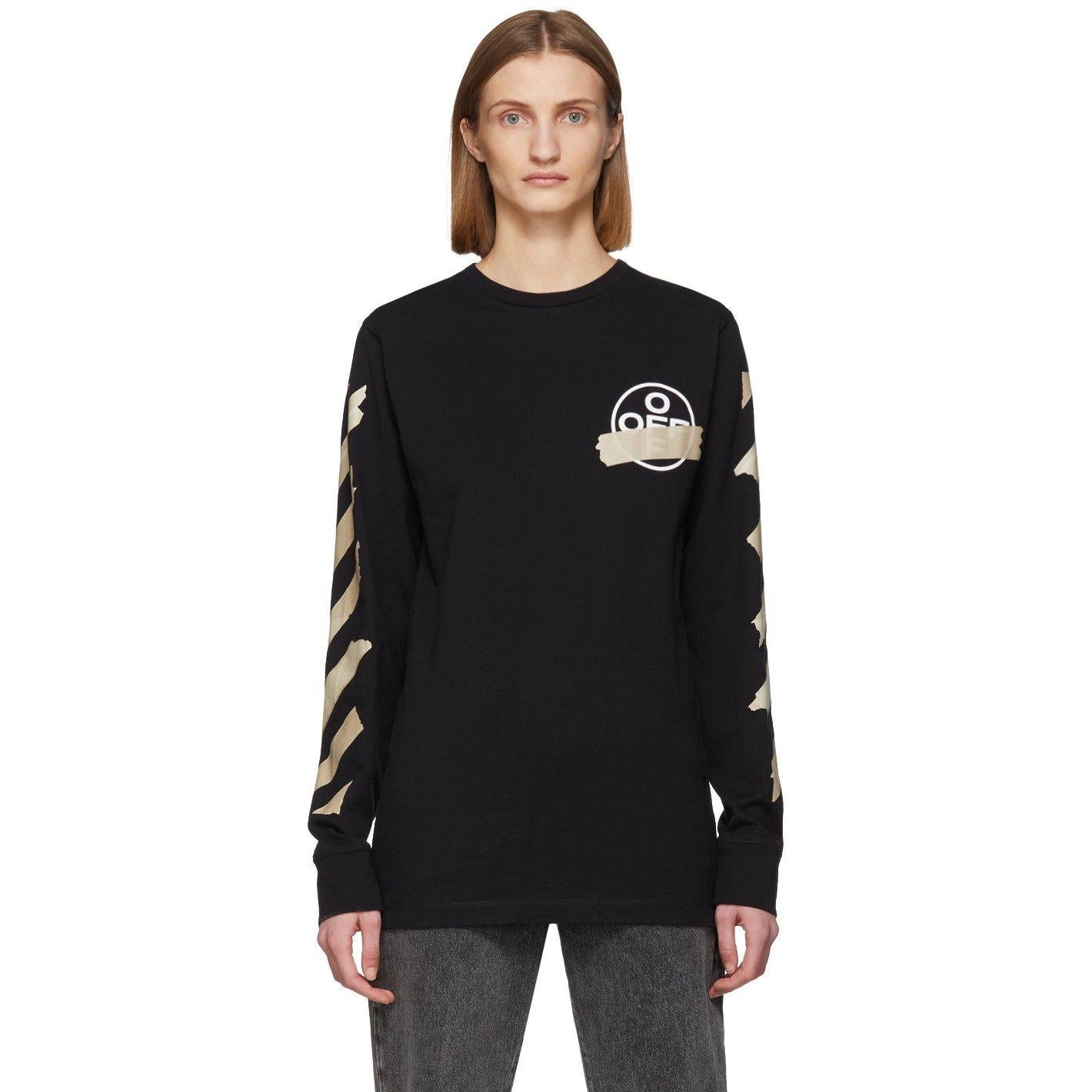Long sleeve cotton jersey t-shirt in black. Rib knit crewneck collar and cuffs. Logo bonded in white and tones of beige at chest. Signature bonded graphics in tones of beige at sleeves and back. Supplier color: Black 100% cotton. Brand: Off-White