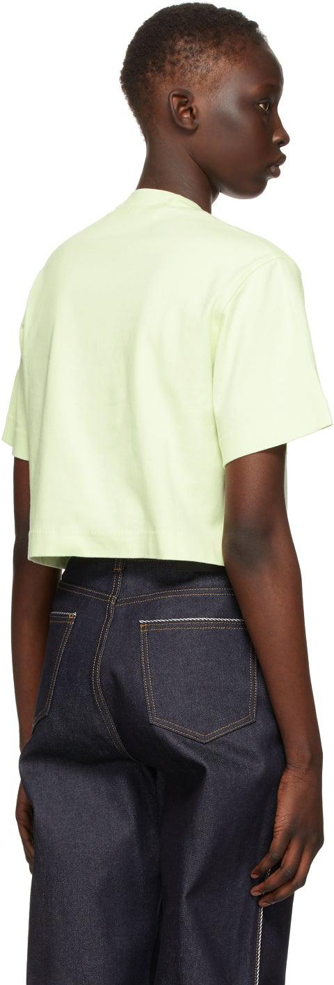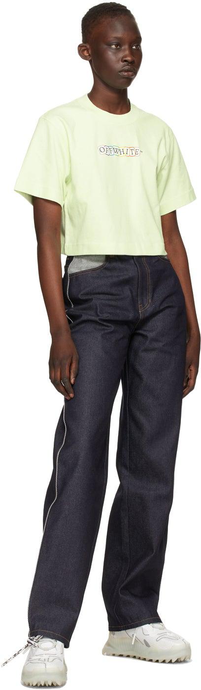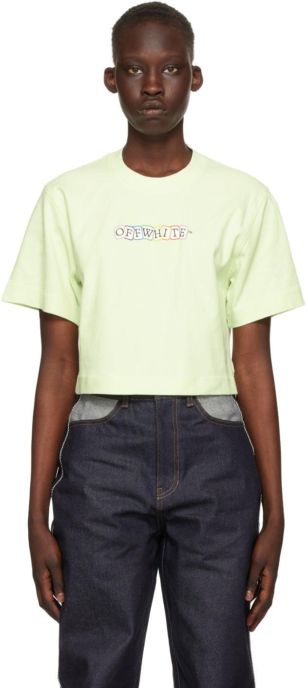 Short sleeve cotton jersey T-shirt in green. Rib knit crewneck collar. Logo printed in multicolor at front. Cropped hem. Supplier color: Green 100% cotton. Brand: Off-White