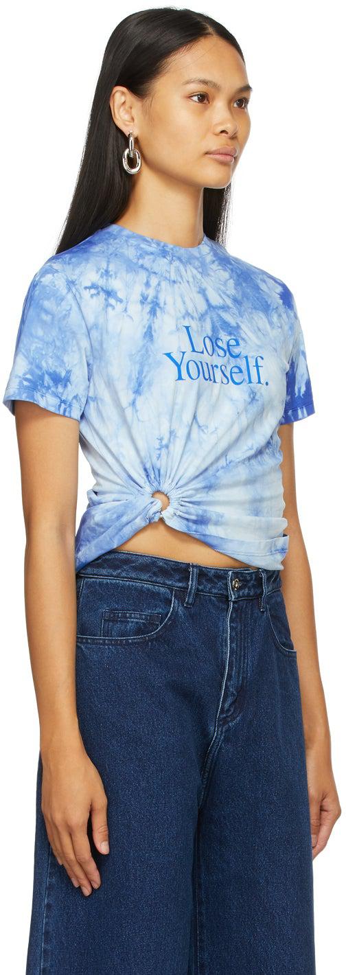 Short sleeve cotton jersey T-shirt featuring tie-dye pattern in tones of blue. Rib knit crewneck collar. Gathering at modified front hem with spring-ring hardware. Silver-tone hardware. Each item is unique. Please note that coloration may vary. Part of the Paco Rabanne x Peter Saville collaboration. Supplier color: Blue 100% cotton. Brand: Paco Rabanne