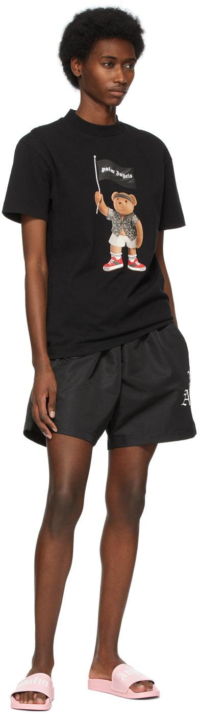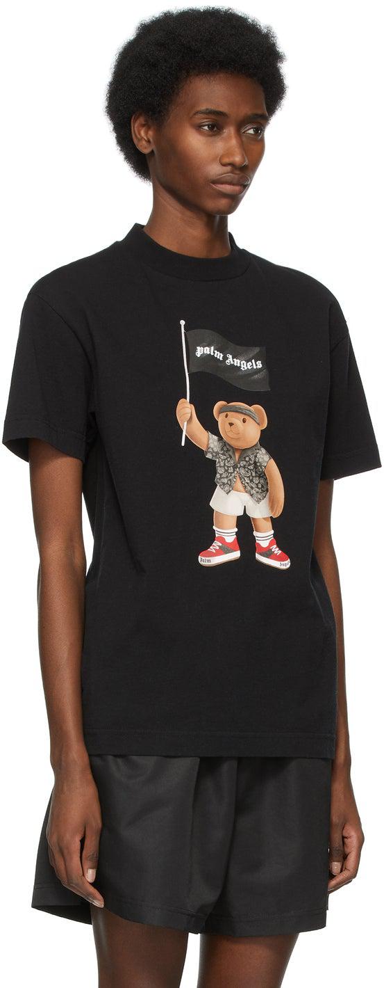 Short sleeve cotton jersey T-shirt in black. Rib knit crewneck collar. Multicolor logo graphic printed at front. Logo flag at side-seam. Supplier color: Black/White 100% cotton. Brand: Palm Angels
