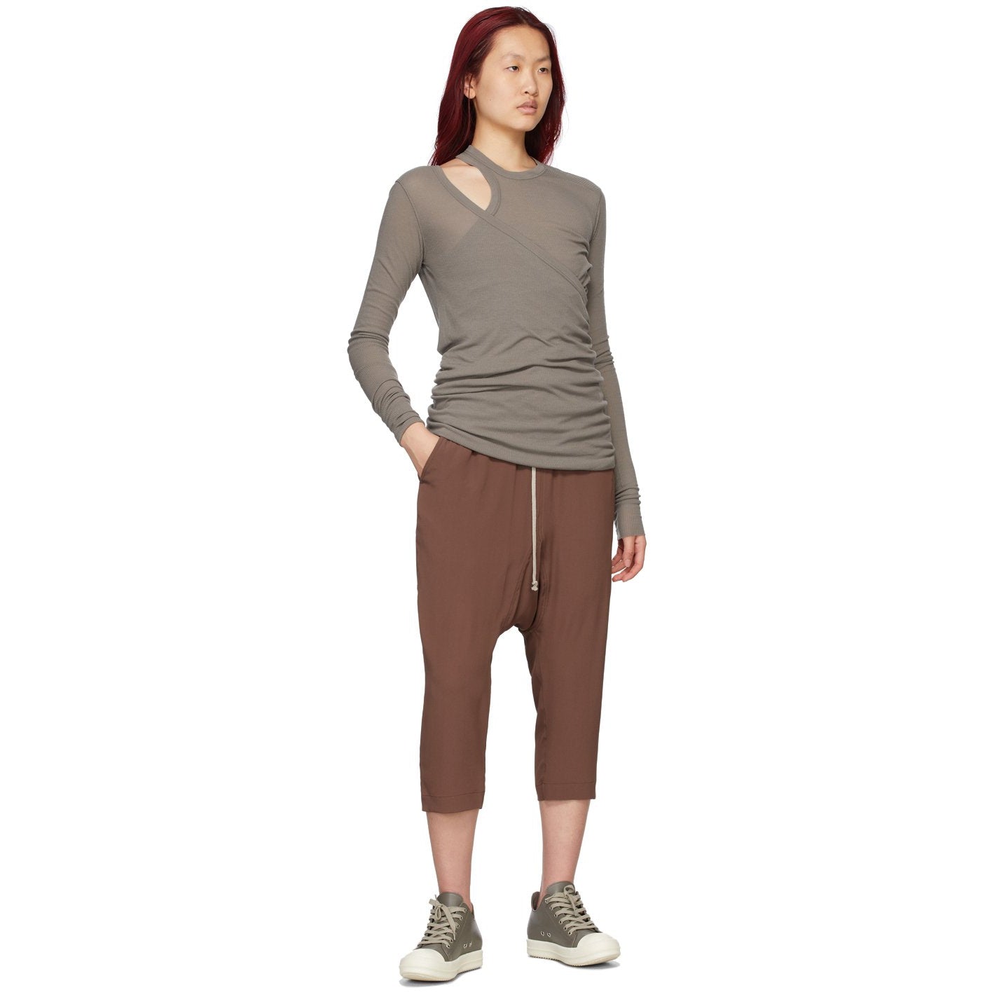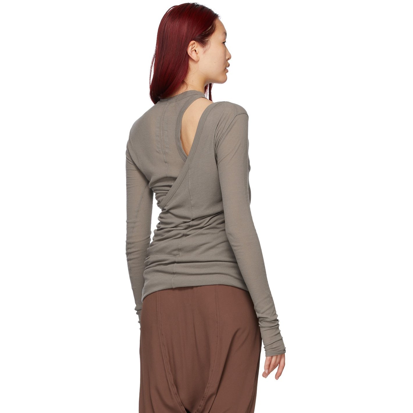 Long sleeve rib knit viscose and silk-blend sweater in grey. Layered construction. Rib knit crewneck collar. Single-shoulder long sleeve T-shirt-style overlay. Supplier color: Dust 88% viscose, 12% silk. Brand: Rick Owens