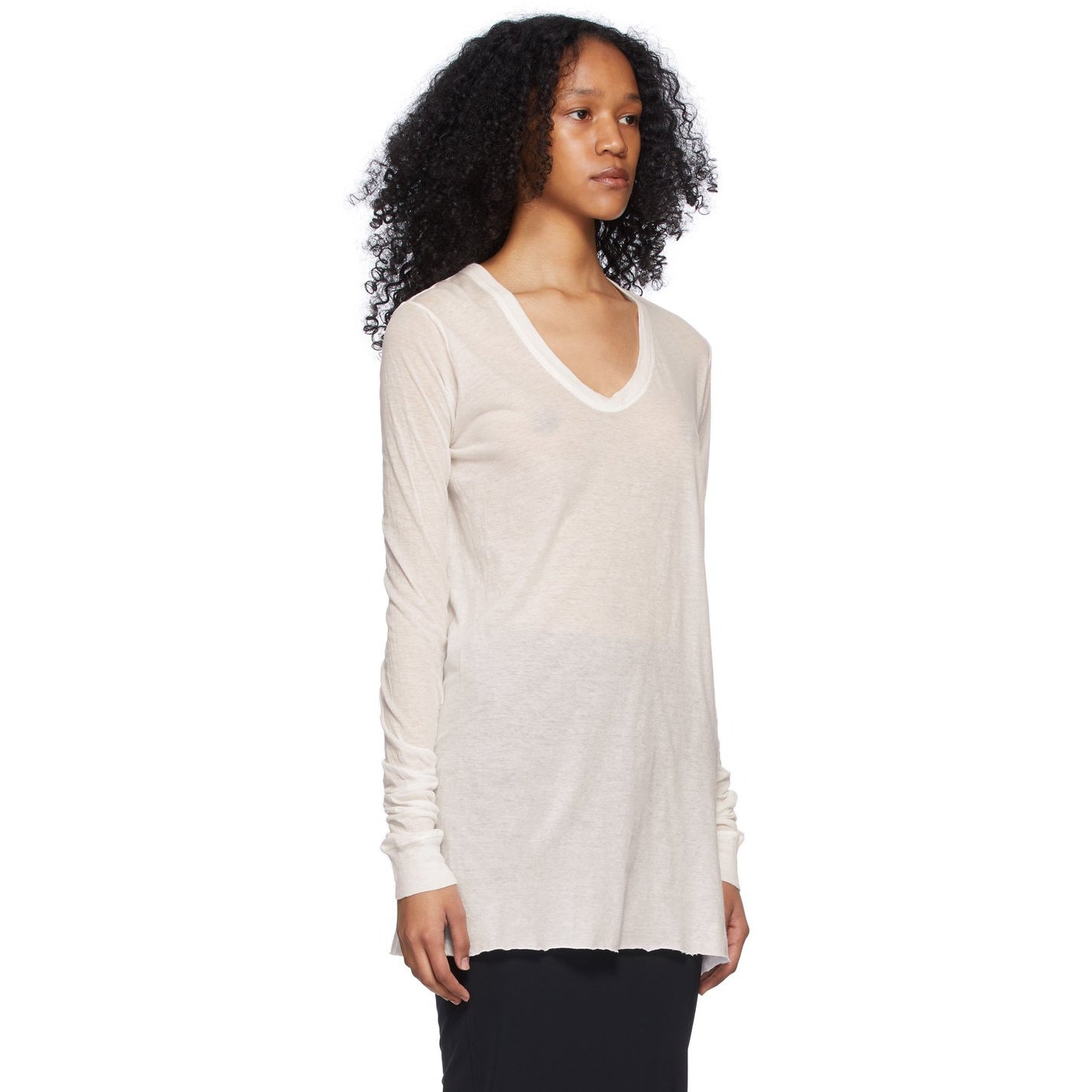 Long sleeve semi-sheer cotton jersey T-shirt in white. Rib knit V-neck collar and cuffs. Gathering at hem. Rolled raw edge at hem. Supplier color: Milk 100% cotton. Brand: Rick Owens