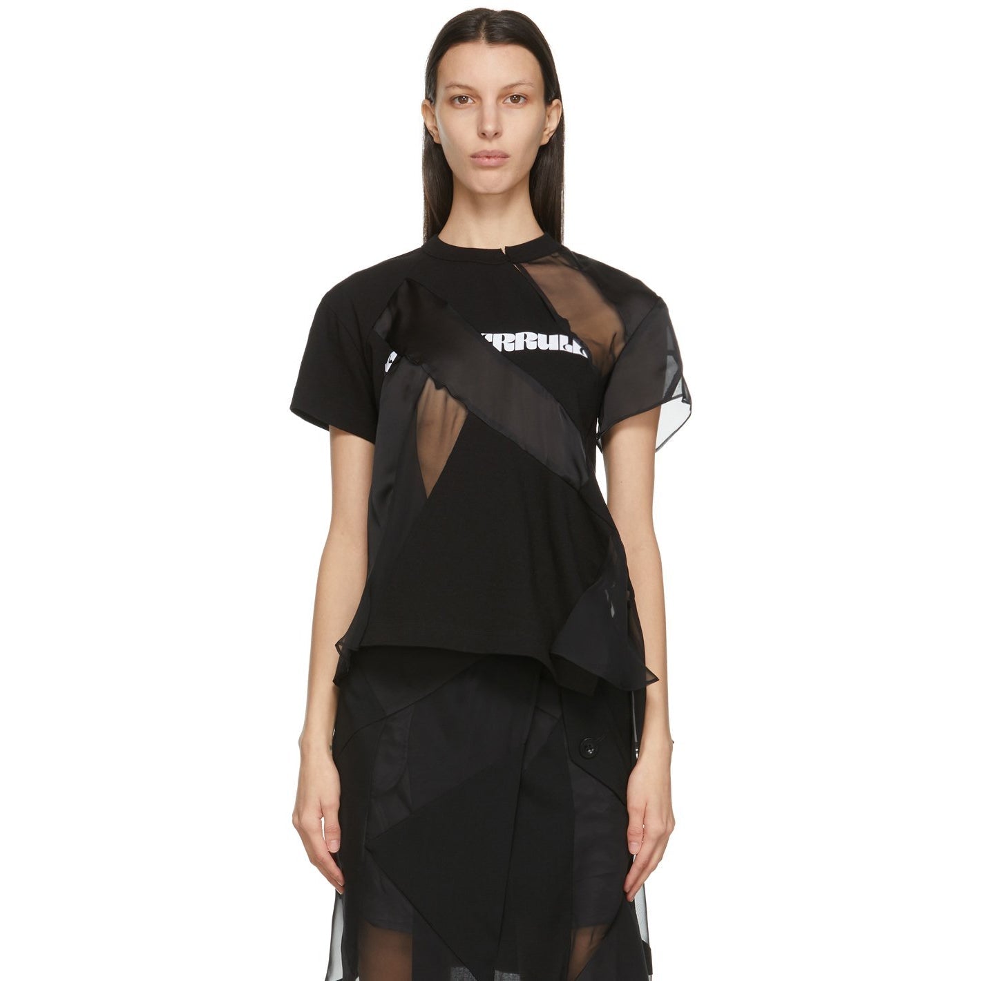 Short sleeve paneled cotton jersey and sheer mesh T-shirt in black. Vented rib knit crewneck collar with hook-eye fastening. Felted graphic appliqué in white at front. Asymmetric hem. Silver-tone hardware. Part of the Sacai x Hank Willis Thomas collaboration. Supplier color: Black Body: 100% cotton. Trim: 100% polyester. Brand: Sacai