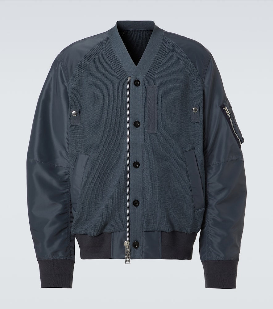 Material: 57% cotton, 43% polyester. Care instructions: dry clean. Made in China. Designer color name: Blue Gray. Lining: 55% polyester, 44% cotton, 1% polyurethane. Filling: 100% polyester. Closure: two-way zipped front, button-down. Pockets: snap-buttoned pockets. Shop the latest mens Sacai Bomber Jackets.
