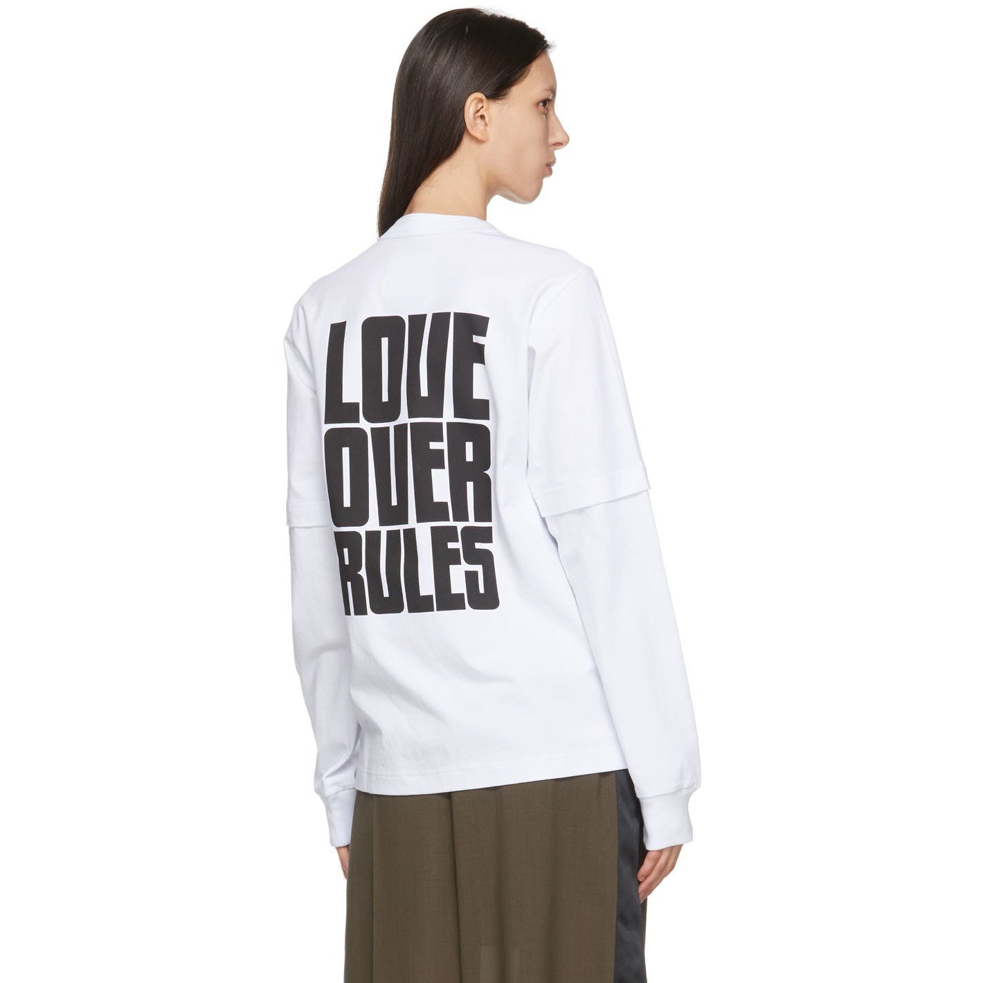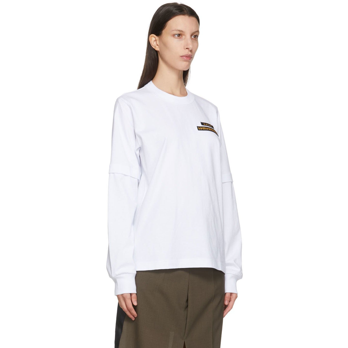 Long sleeve cotton jersey T-shirt in white. Layered construction. Rib knit crewneck collar and cuffs. Logo patch and graphic patch in yellow and black at chest. Text printed in black at back. Part of the Sacai x Hank Willis Thomas collaboration. Supplier color: White 100% cotton. Brand: Sacai