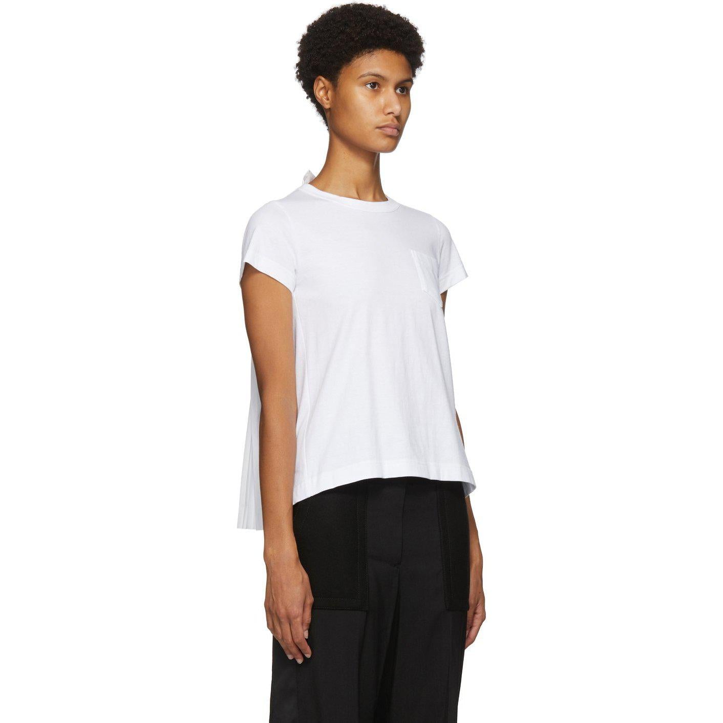 Short sleeve paneled cotton jersey and cotton-blend poplin T-shirt in white. Partially rib knit crewneck collar. Patch pocket at chest. Pleats at back. Raw edge at back hem. Supplier color: White Body: 100% cotton. Trim: 65% polyester, 35% cotton. Brand: Sacai