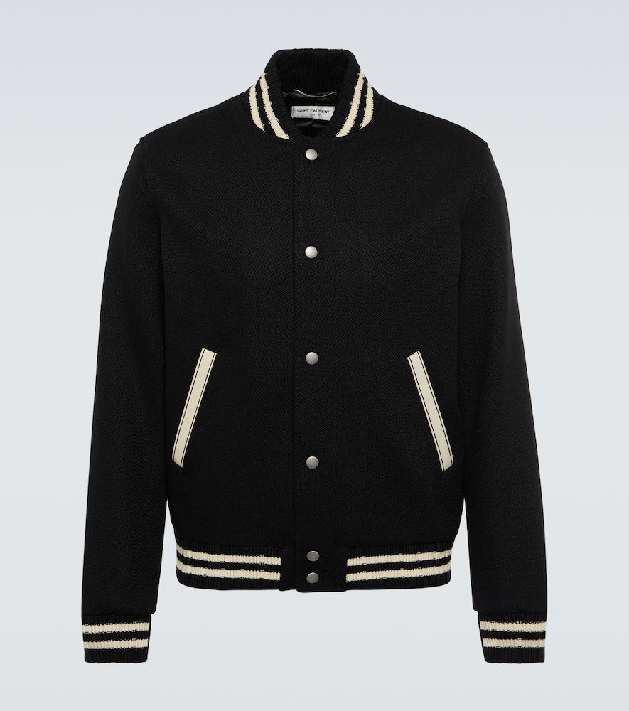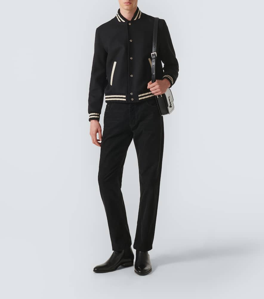 Made in Italy. Trim: 97% wool, 2% polyamide, 1% elastane. Care instructions: specialist clean. Designer color name: Nero. Material: 90% wool, 10% polyamide. Pocket lining: 100% cotton, fully lined. Contains non-textile parts of animal origin. Elasticated waistband. Lining: 60% cupro, 40% cotton, fully lined. Pockets: side slit pockets, internal pockets. Closure: buttoned front. Elasticated cuffs. Embroidery: 100% calf leather. Shop the latest mens Saint Laurent Bomber Jackets.