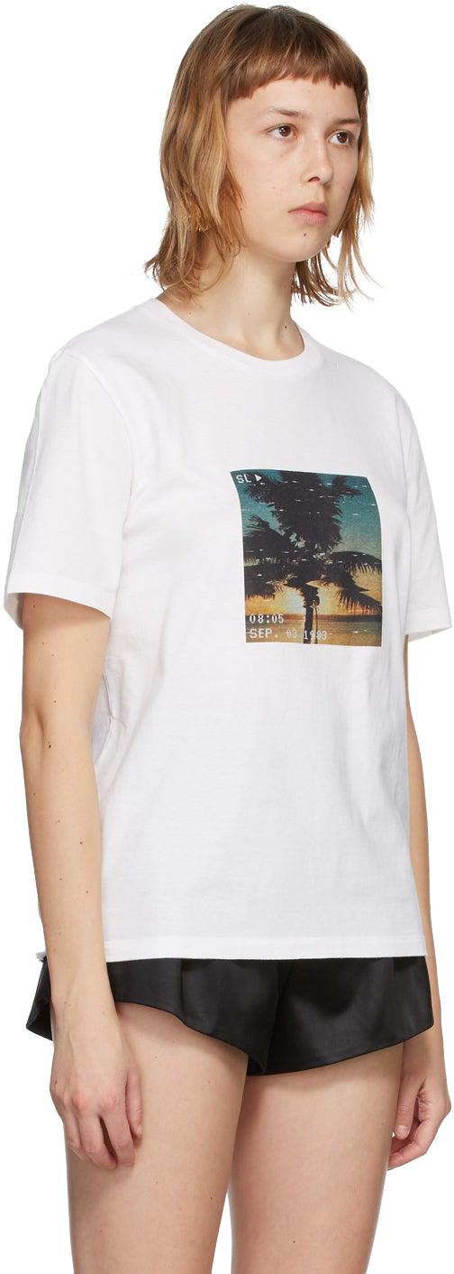 Short sleeve cotton jersey T-shirt in white. Rib knit crewneck collar. Graphic printed in multicolor at front. Supplier color: White 100% cotton. Brand: Saint Laurent