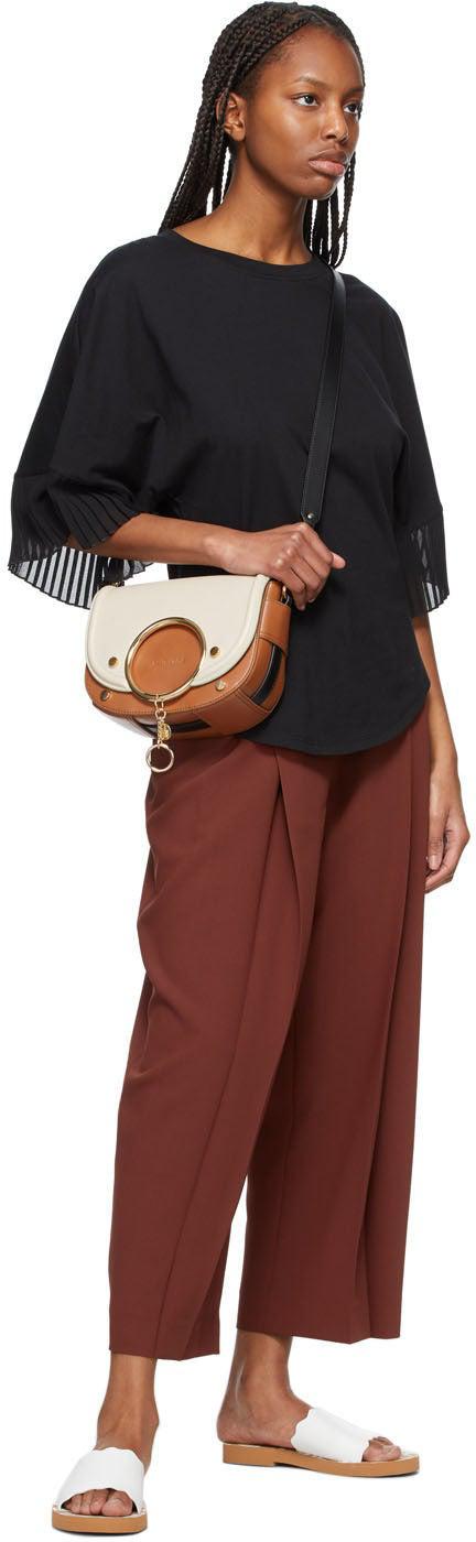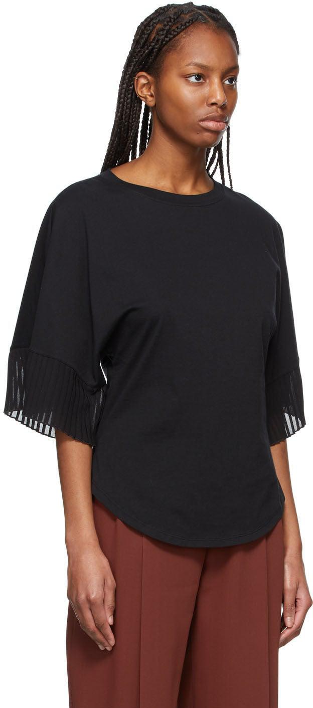 Three-quarter sleeve T-shirt in black. Rib knit crewneck collar. Tonal pleated georgette trim at cuffs. Shirttail hem. Supplier color: Black Body: 100% cotton. Trim: 100% polyester. Brand: See by Chloé