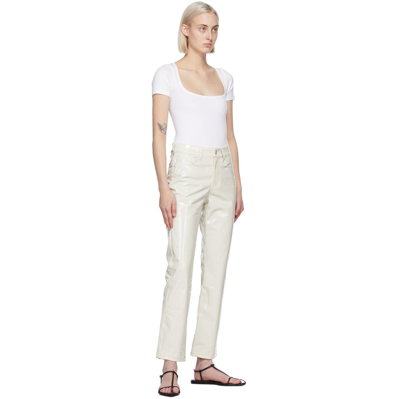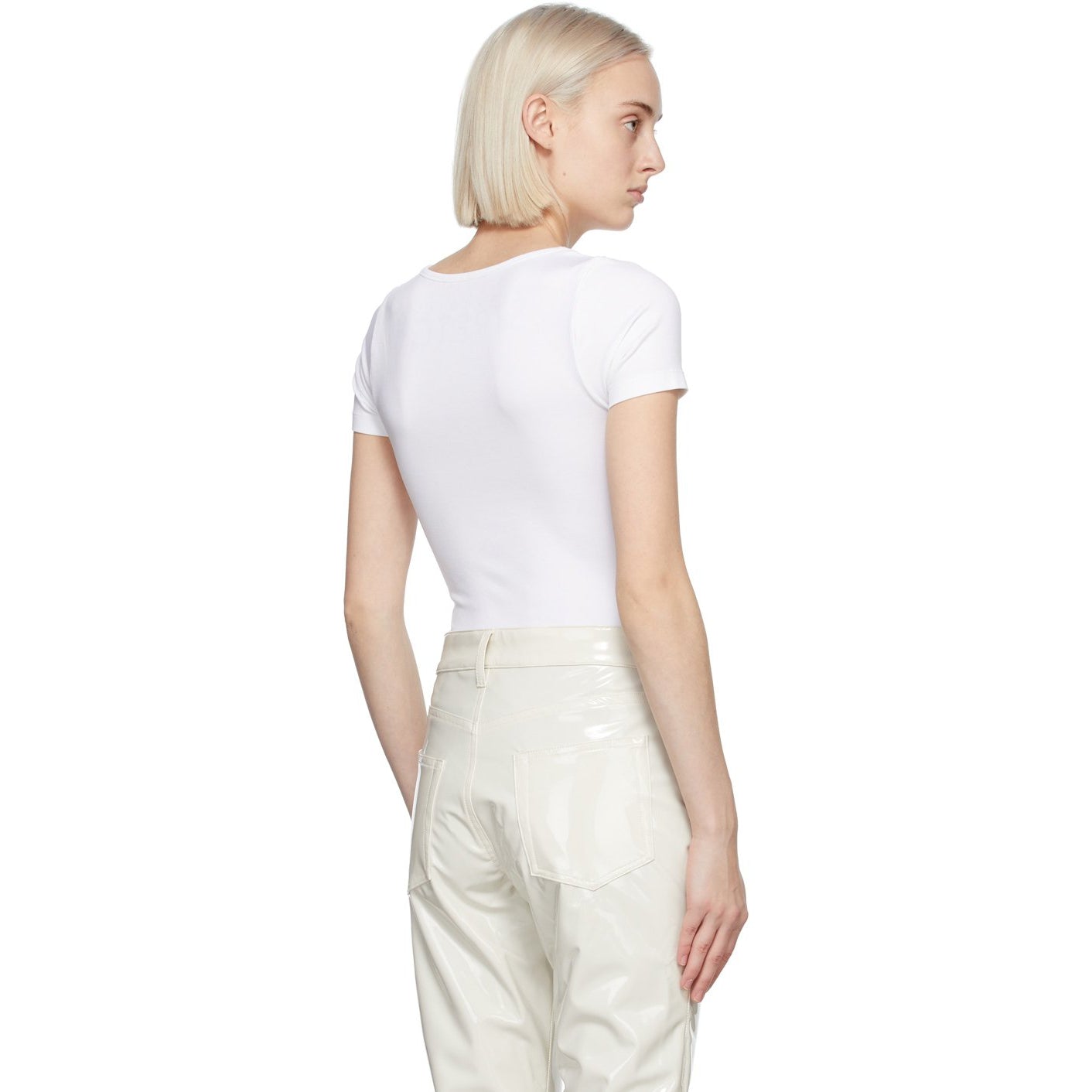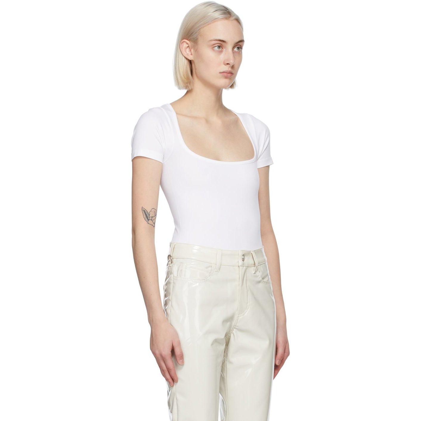 Short sleeve stretch nylon jersey T-shirt in white. Square neck collar. Thong-style bottom. Supplier color: White 97% nylon, 3% spandex. Brand: Simon Miller