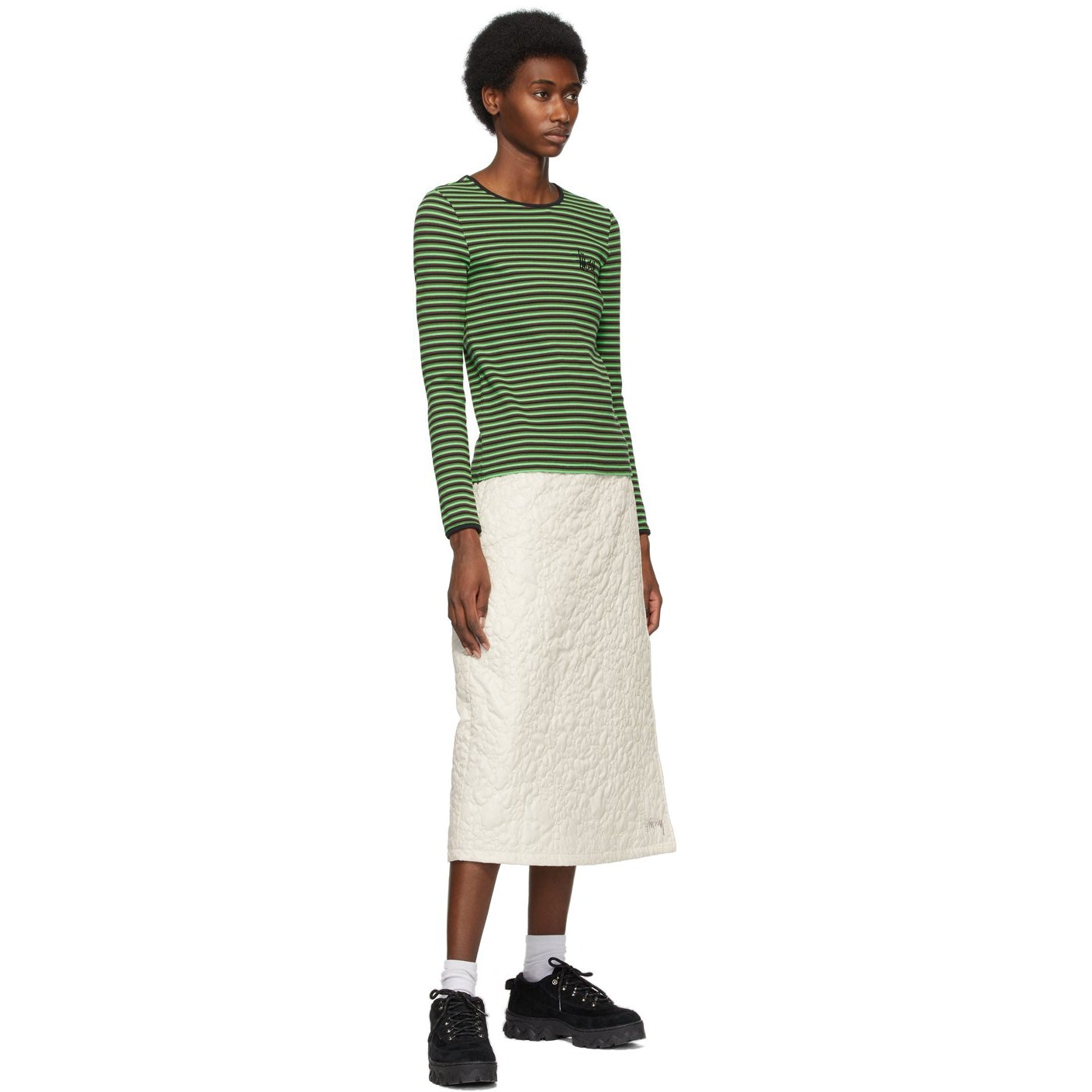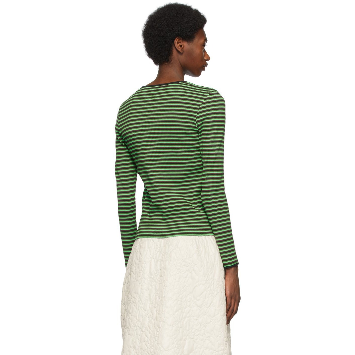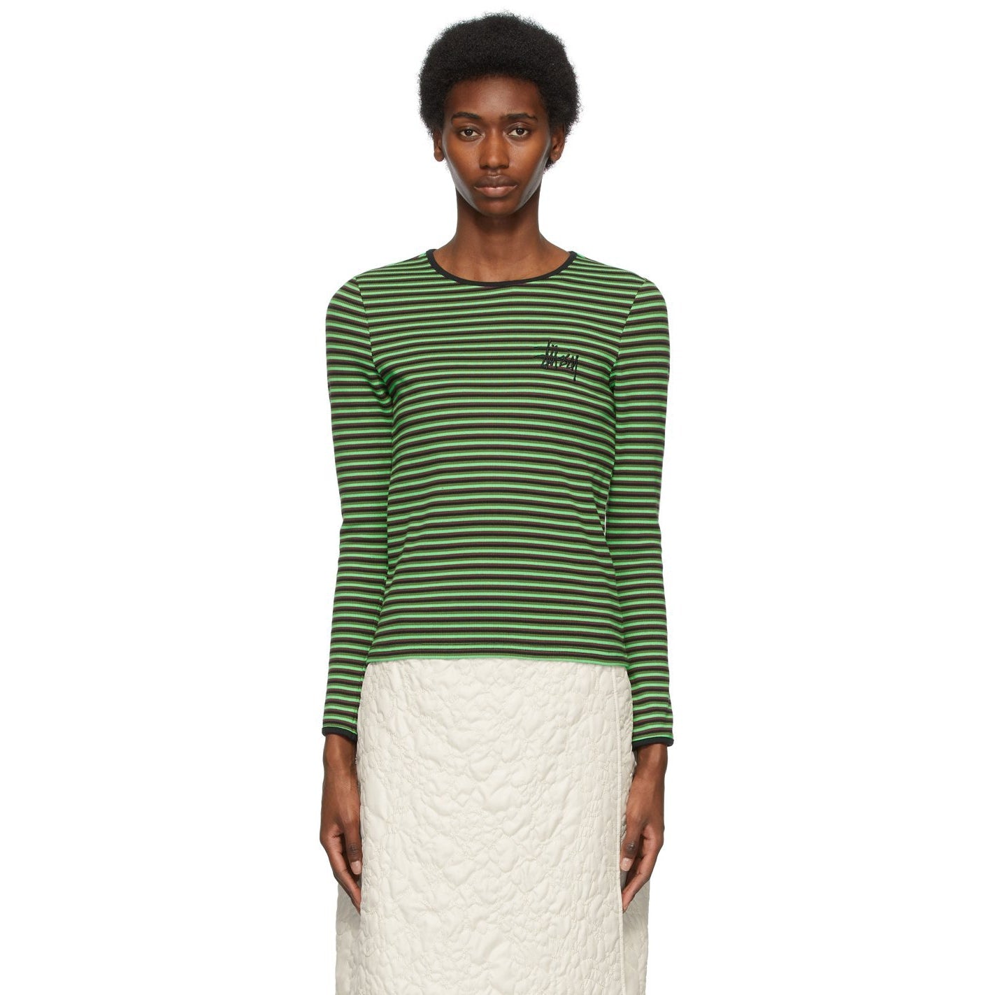 Long sleeve yarn-dyed T-shirt striped in tones of green, brown, and black. Rib knit trim in black at scoop neck collar. Logo embroidered in black at chest. Supplier color: Green 95% cotton, 5% spandex. Brand: Stüssy