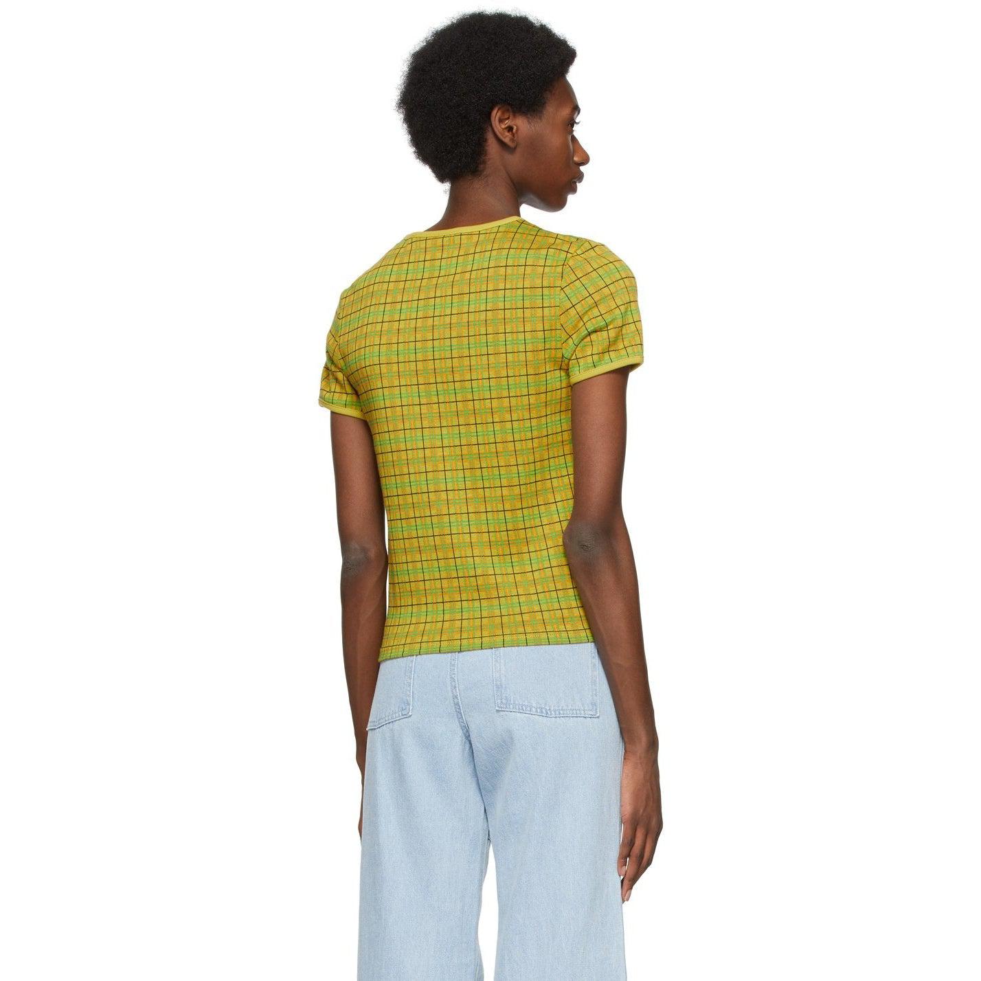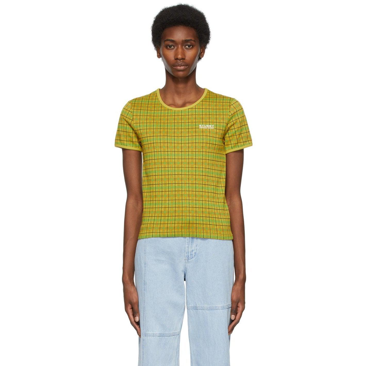 Short sleeve cotton jersey T-shirt featuring check pattern in yellow, orange and green. Rib knit scoop neck collar and cuffs. Logo embroidered in off-white at chest. Supplier color: Citrus 100% cotton. Brand: Stüssy