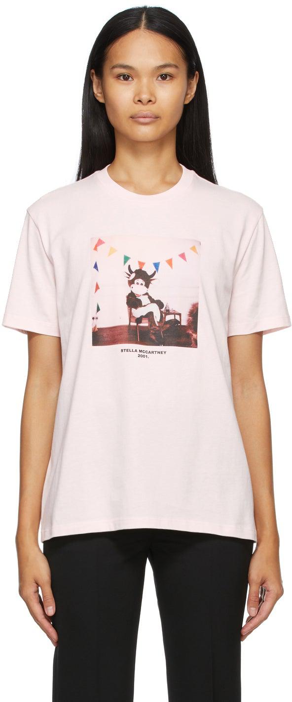 Short sleeve cotton jersey T-shirt in pink. Rib knit crewneck collar. Text and logo printed in black and graphic printed in multicolor at front. Text printed in black at back collar. Made from cruelty-free, non-animal materials. Supplier color: Sherbert 100% cotton. Brand: Stella McCartney