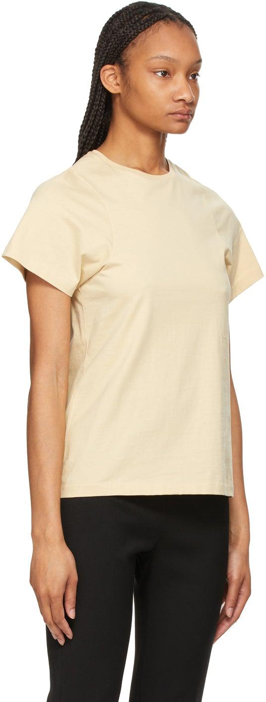 Short sleeve organic cotton jersey T-shirt in beige. Rib knit crewneck collar. Tonal logo embroidered at front. Curved armscyes. Supplier color: Champagne 100% organic cotton. Brand: Totême