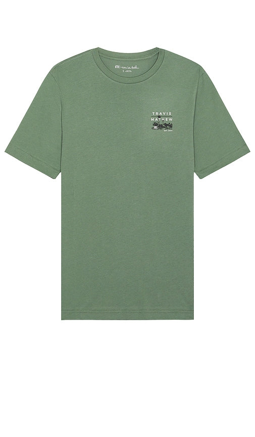 TravisMathew Greenway Trail Tee in Green. - size M (also in S, XL/1X) TravisMathew Greenway Trail Tee in Green. - size M (also in S, XL/1X) 100% cotton. Made in Peru. Machine wash. Front and back screenprint graphics. Jersey fabric with ribbed neckline. TVMR-MS4. 1MZ195. Shop the latest in fashion from TravisMathew