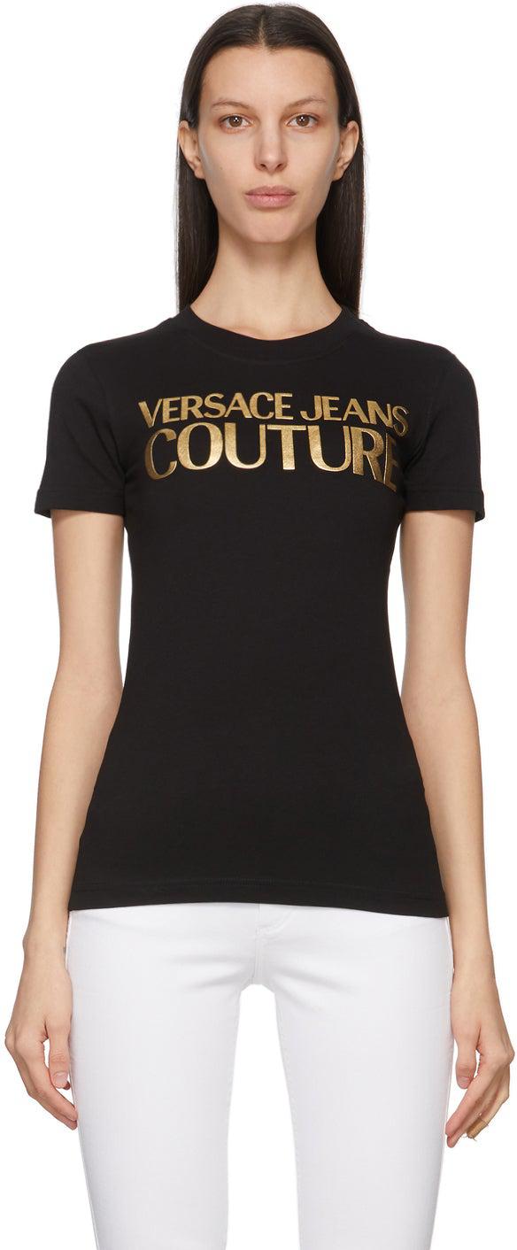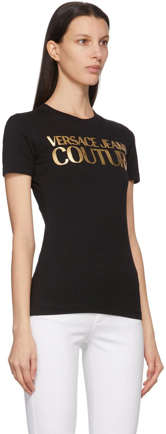 Short sleeve cotton jersey T-shirt in black. Rib knit crewneck collar. Logo bonded in gold-tone at front. Supplier color: Black/Gold 100% cotton. Brand: Versace Jeans Couture
