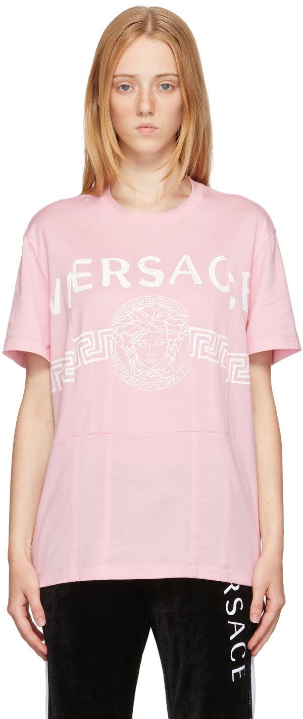 Short sleeve paneled cotton jersey T-shirt in pink featuring pintuck detailing at front and back. Rib knit crewneck collar. Logo, Greek key, and signature Medusa graphic printed in white at chest. Supplier color: Rose 100% cotton. Brand: Versace