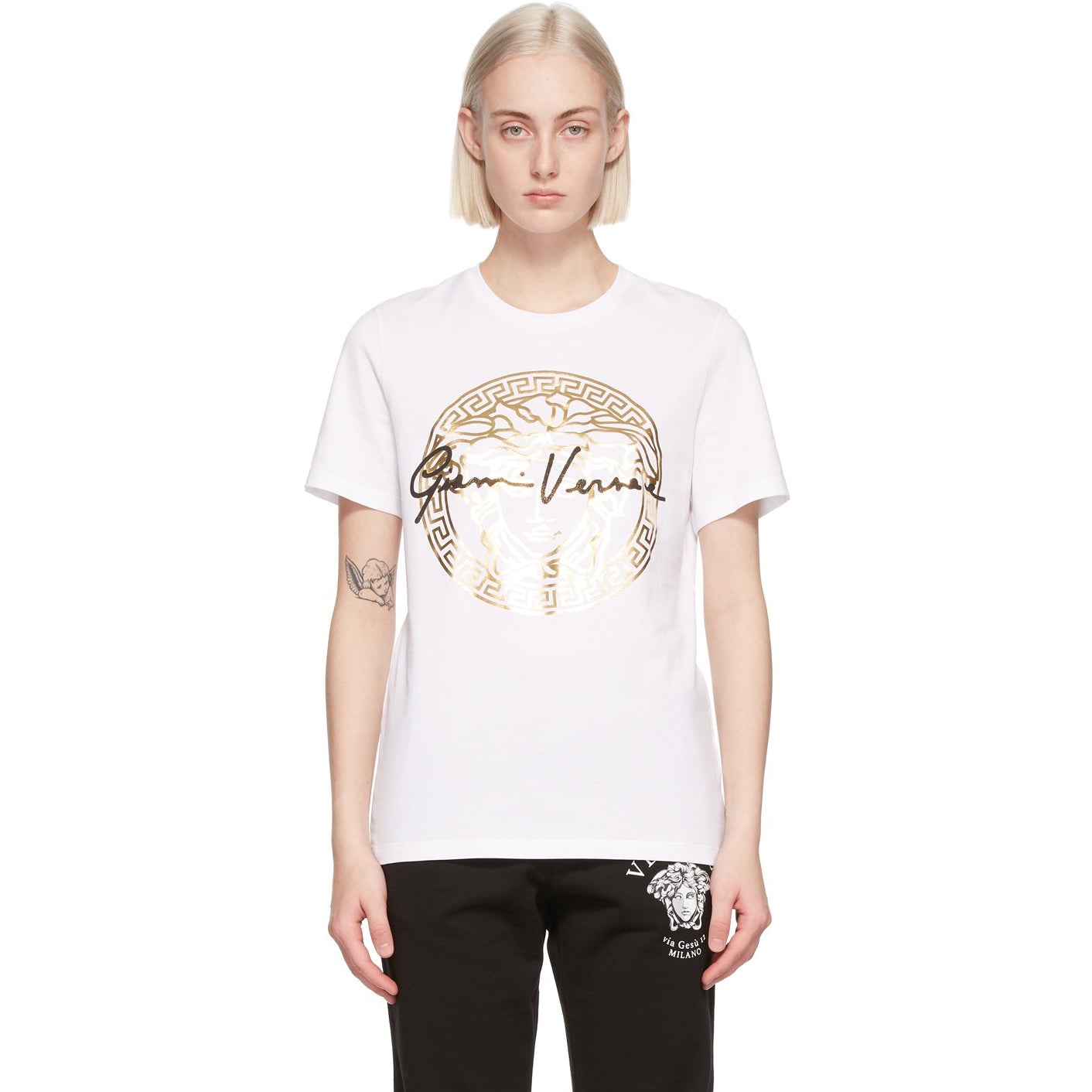 Short sleeve cotton jersey T-shirt in white. Rib knit crewneck collar. Medusa printed in gold-tone at front. Logo printed in black at front. Available exclusively at SSENSE. Supplier color: White 100% cotton. Brand: Versace