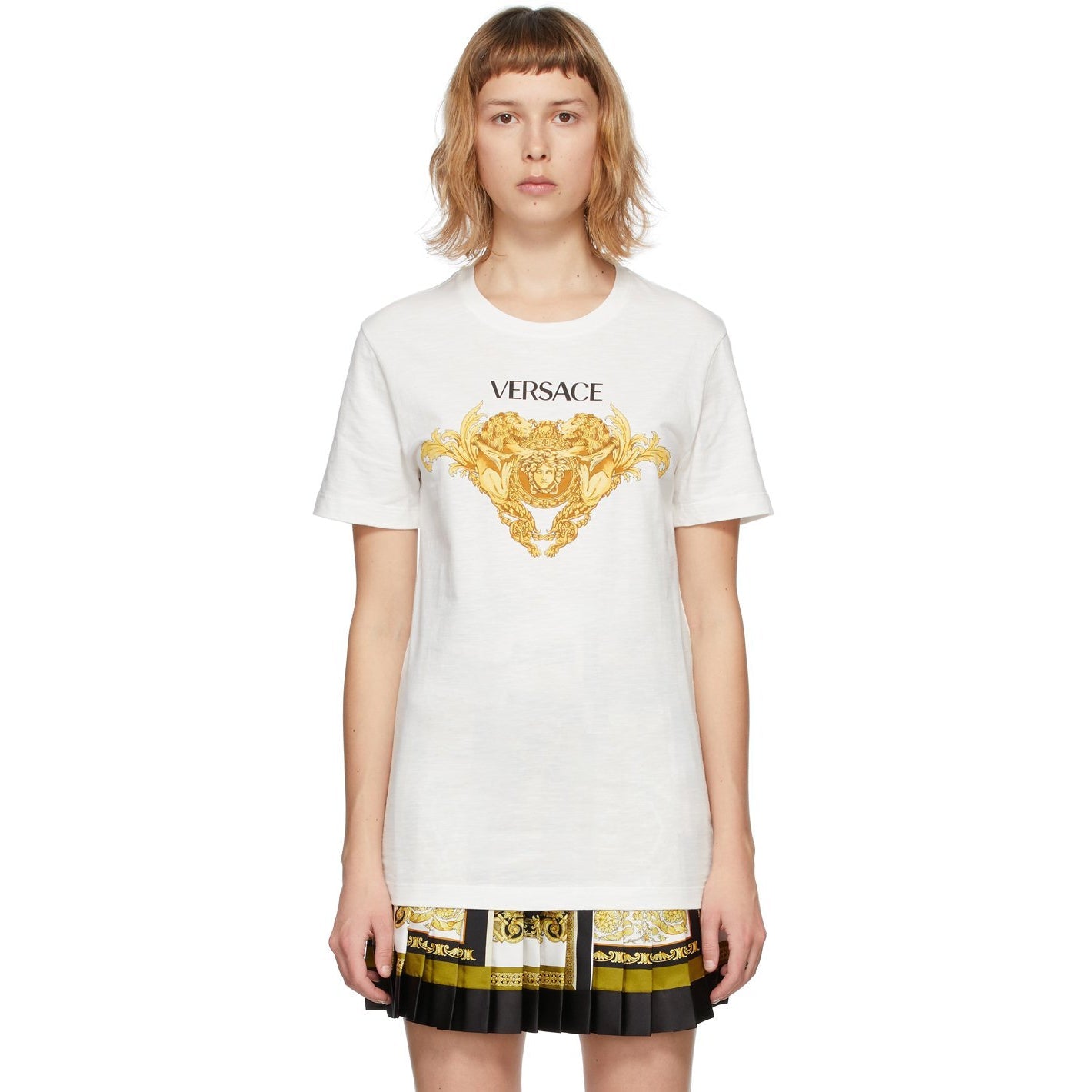 Short sleeve cotton jersey T-shirt in white. Rib knit crewneck collar. Signature Medusa and logo printed in white and tones of yellow at front. Supplier color: White 100% cotton. Brand: Versace