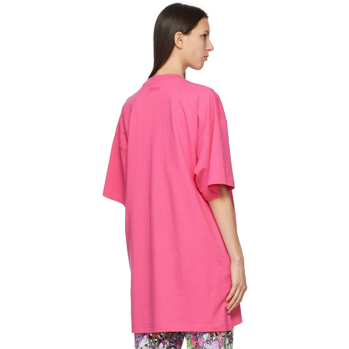 Short sleeve cotton jersey T-shirt in pink. Rib knit crewneck collar. Logo and text printed in black at chest. Tonal logo embroidered at back collar. Supplier color: Hot pink 100% cotton. Brand: VETEMENTS