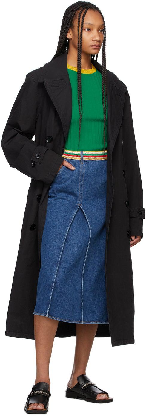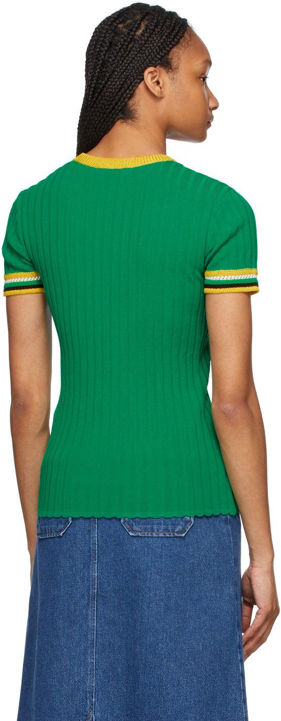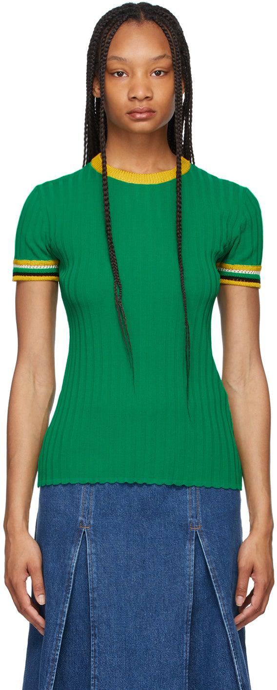 Short sleeve rib knit viscose and nylon-blend T-shirt in green. Rib knit crewneck collar in yellow. Rib knit and open knit cuffs striped in yellow, off-white, and black. Supplier color: Green Body: 65% viscose, 35% polyamide. Trim: 80% rayon, 20% polyamide. Brand: Wales Bonner