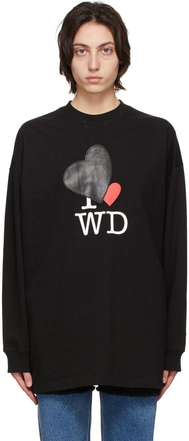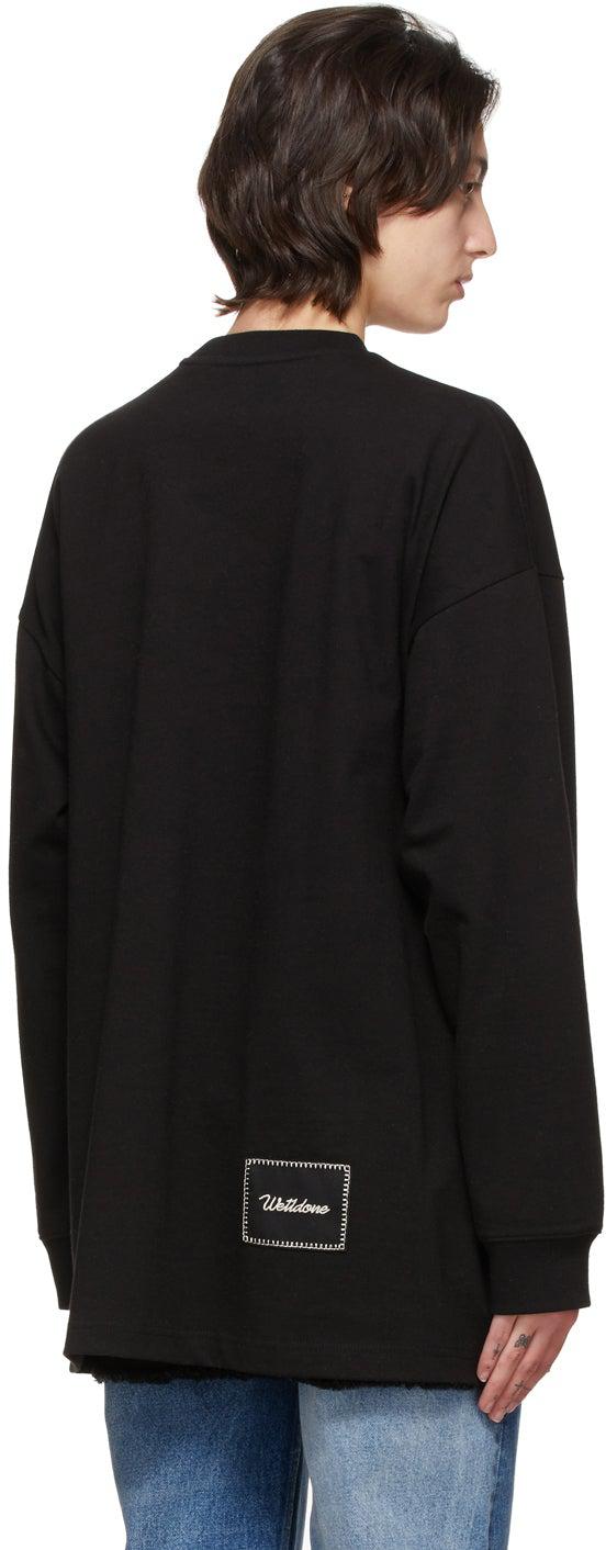 Long sleeve cotton jersey T-shirt in black. Rib knit crewneck collar and cuffs. Tonal grained leather graphic patch and logo printed in white and red at front. Welt pockets at waist. Embroidered logo patch in black and silver-tone at back hem. Supplier color: Black Body: 100% cotton. Trim: 98% cotton, 2% polyurethane. Brand: We11done