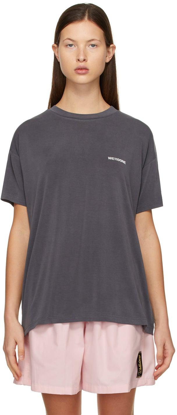 Short sleeve modal-blend jersey T-shirt in grey. Rib knit crewneck collar. Logo printed in white at chest. Rubberized logo patch in black at back hem. Supplier color: Grey 71% modal, 24% polyester, 5% polyurethane. Brand: We11done