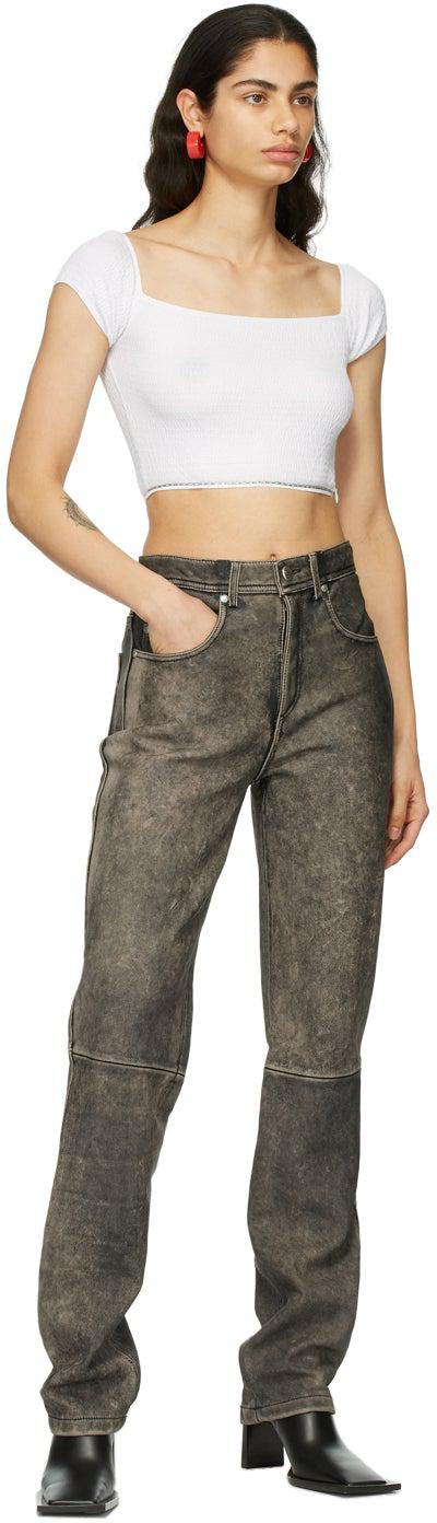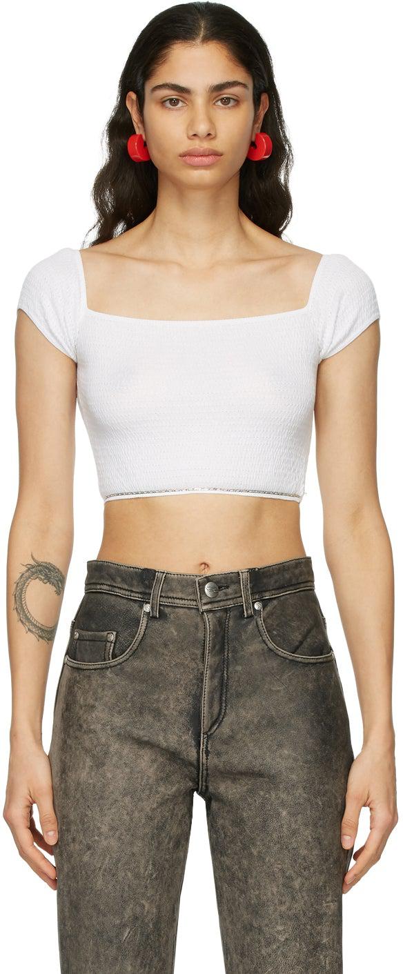 Short sleeve knit cotton-blend T-shirt in white. Boat neck collar. Chain link hardware detailing at hem. Concealed zip closure at side-seam. Silver-tone hardware. Supplier color: White 96% cotton, 3% polyester, 1% polyurethane. Brand: We11done
