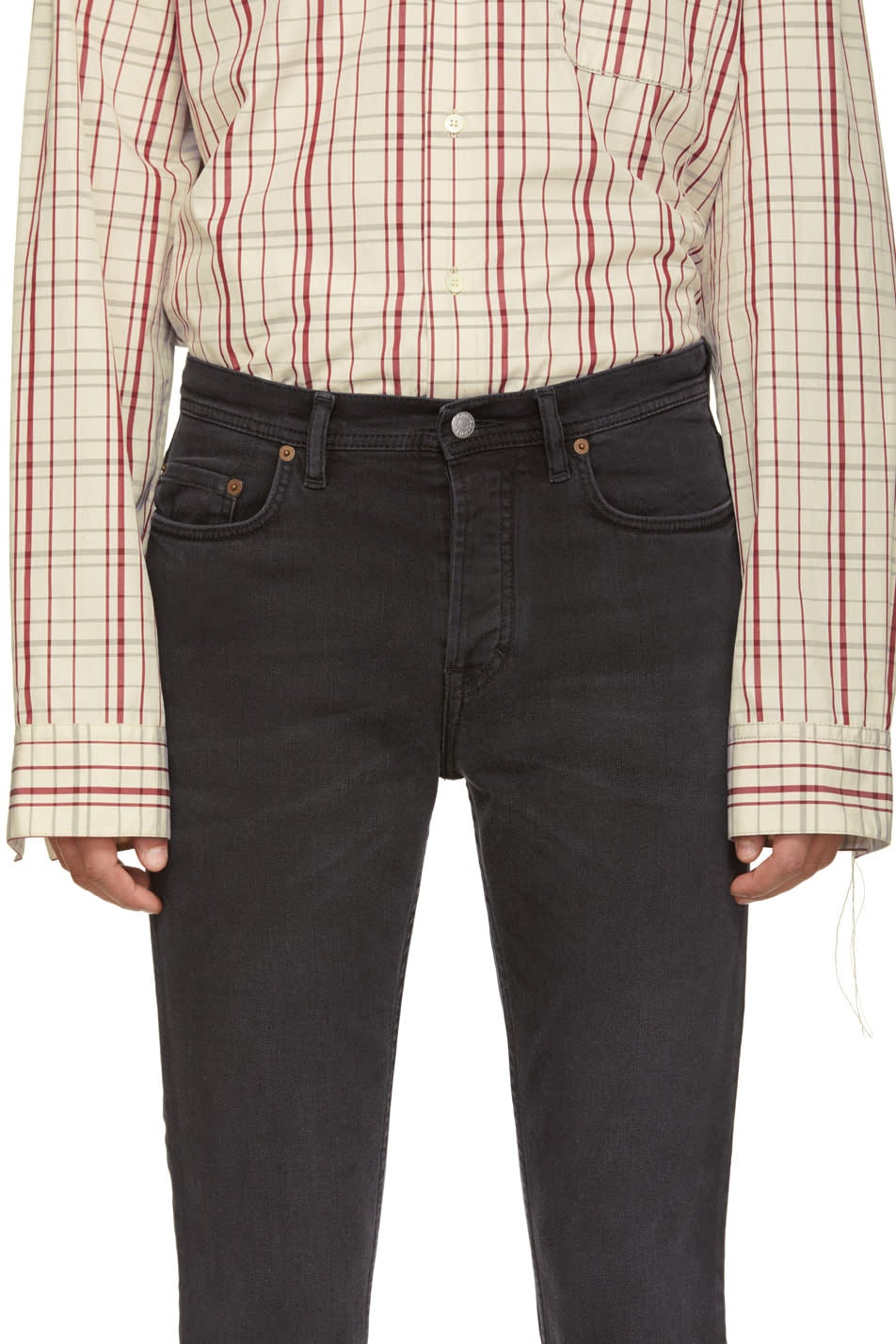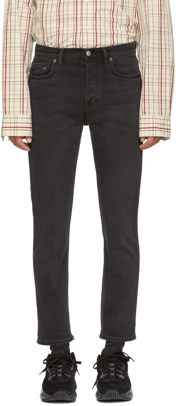 Tapered stretch denim jeans in 'used' black. Fading and whiskering throughout. Mid-rise. Five-pocket styling. Leather logo patch in black and pink at back waistband. Button-fly. Logo-engraved silver-tone and bronze-tone hardware. Tonal stitching. Part of the Acne Studios Blå Konst collection. 94% cotton, 5% polyester, 1% elastane. Brand: Acne Studios