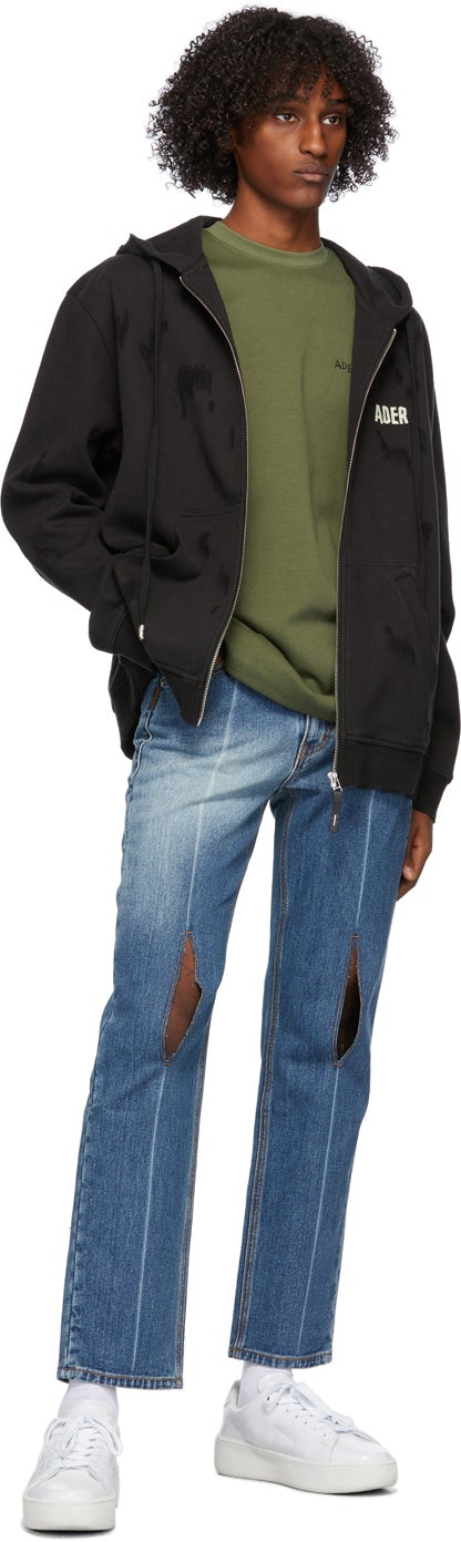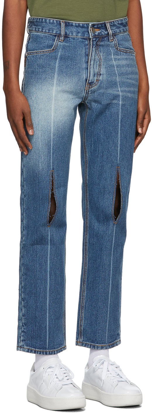 Straight-leg non-stretch denim jeans in blue. Mid-rise. Fading throughout. Four-pocket styling. Belt loops at waistband. Graphic hardware and topstitching at front pockets. Slit at knees. Modified belt loop featuring logo hardware at back waistband. Honeycombing at back legs. Zip-fly. Silver-tone hardware. Contrast stitching in brown. Supplier color: Blue 100% cotton. Brand: ADER error