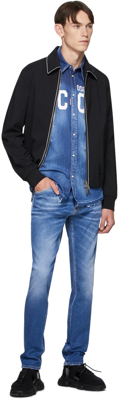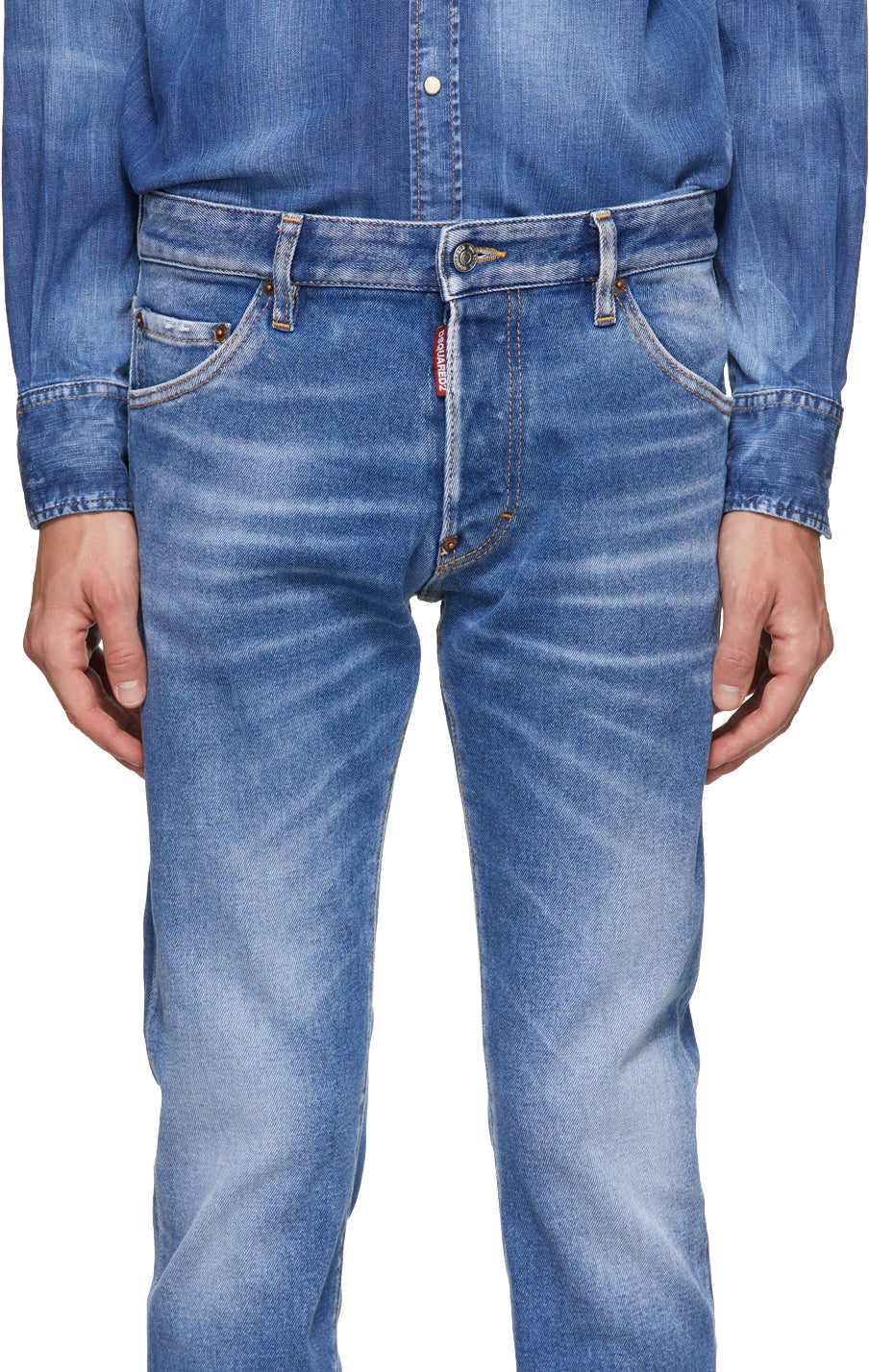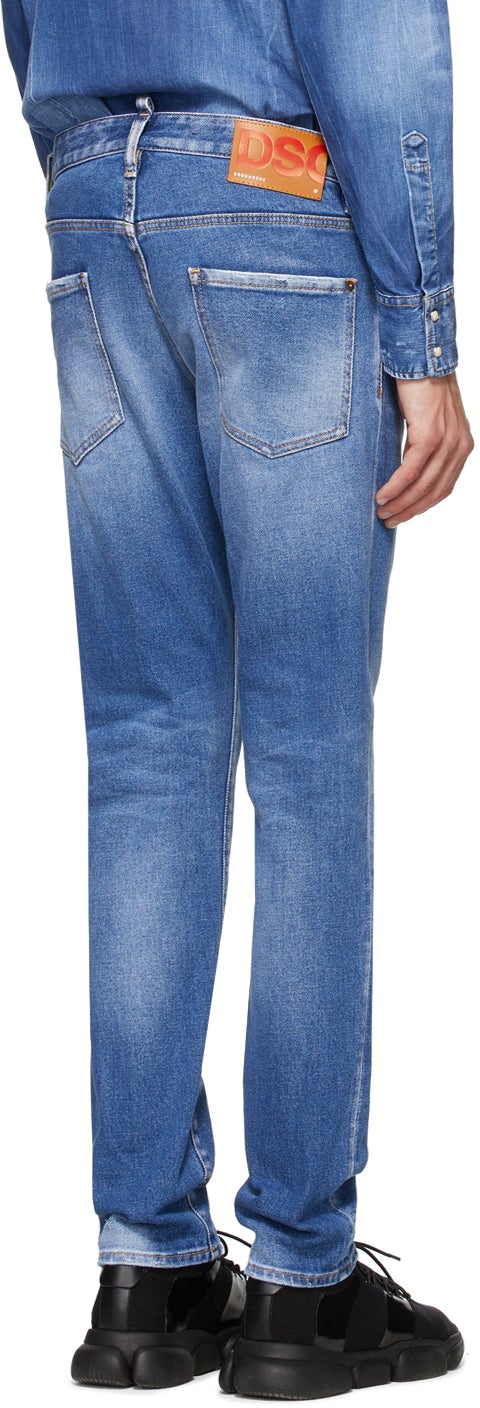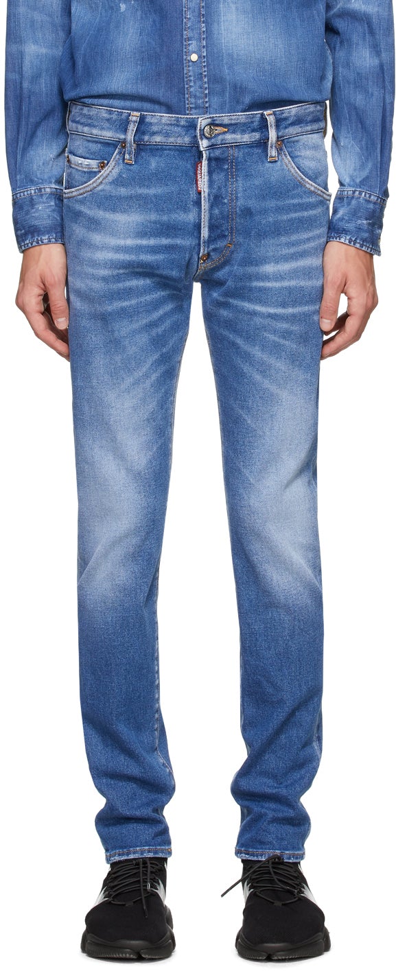Slim-fit stretch denim jeans in blue. Mid-rise. Fading, whiskering, and distressing throughout. Five-pocket styling. Belt loops and leather logo patch at waistband. Button-fly. Logo-engraved silver-tone hardware. Contrast stitching in orange. Supplier color: Blue 98% cotton, 2% elastane. Brand: Dsquared2