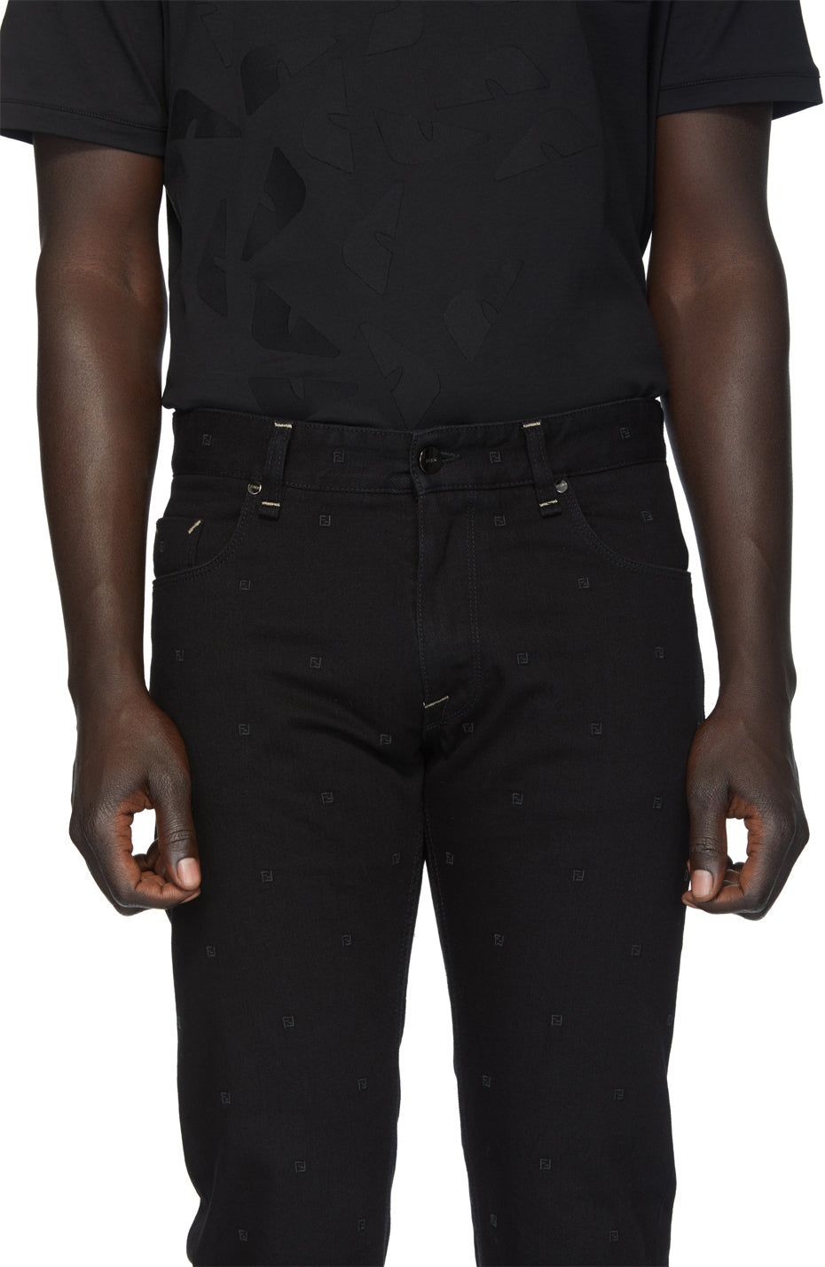 Slim-fit non-stretch denim trousers in black featuring tonal embroidered logo throughout. Mid-rise. Five-pocket styling. Belt loops and leather logo patch at waistband. Zip-fly. Logo-engraved silver-tone hardware. Supplier color: Black 100% cotton. Brand: Fendi
