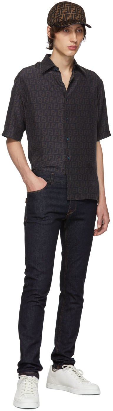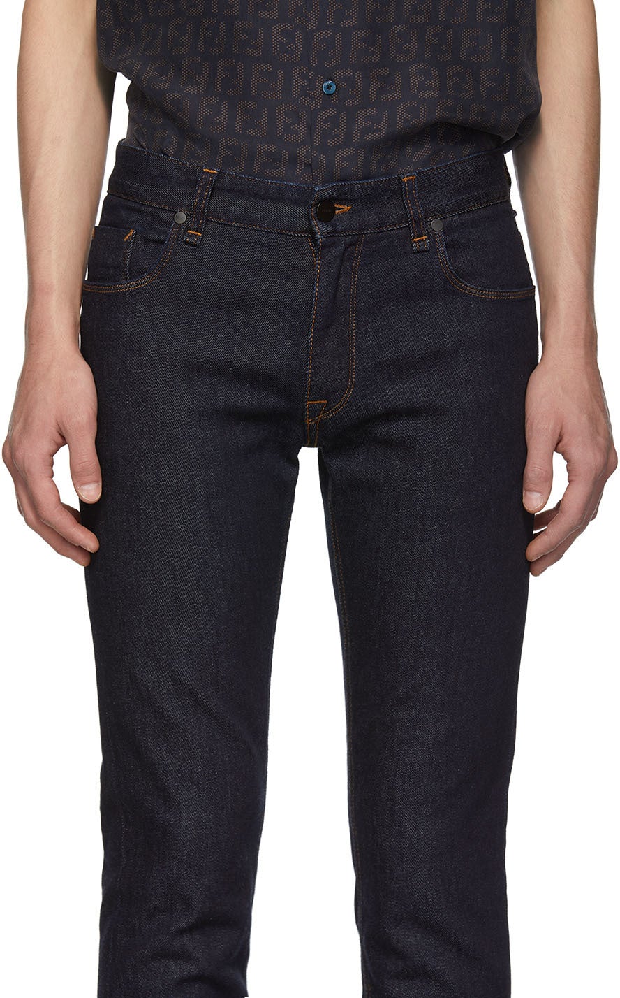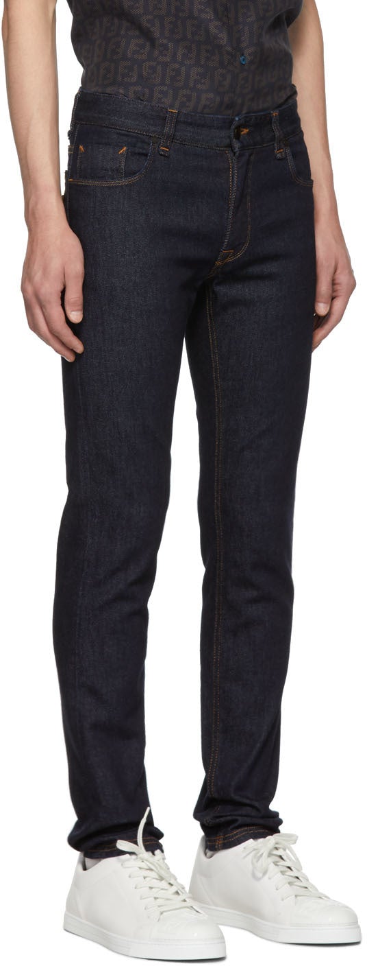 Slim-fit non-stretch denim jeans in blue. Mid-rise. Five-pocket styling. Belt loops at waistband. Rubberized logo patch in black and gold-tone at back waistband. Woven logo pattern in brown and taupe at back pocket featuring logo flag in brown. Logo-engraved black and silver hardware. Contrast stitching in tan. Supplier color: Dark blue 98% cotton, 2% elastane. Brand: Fendi